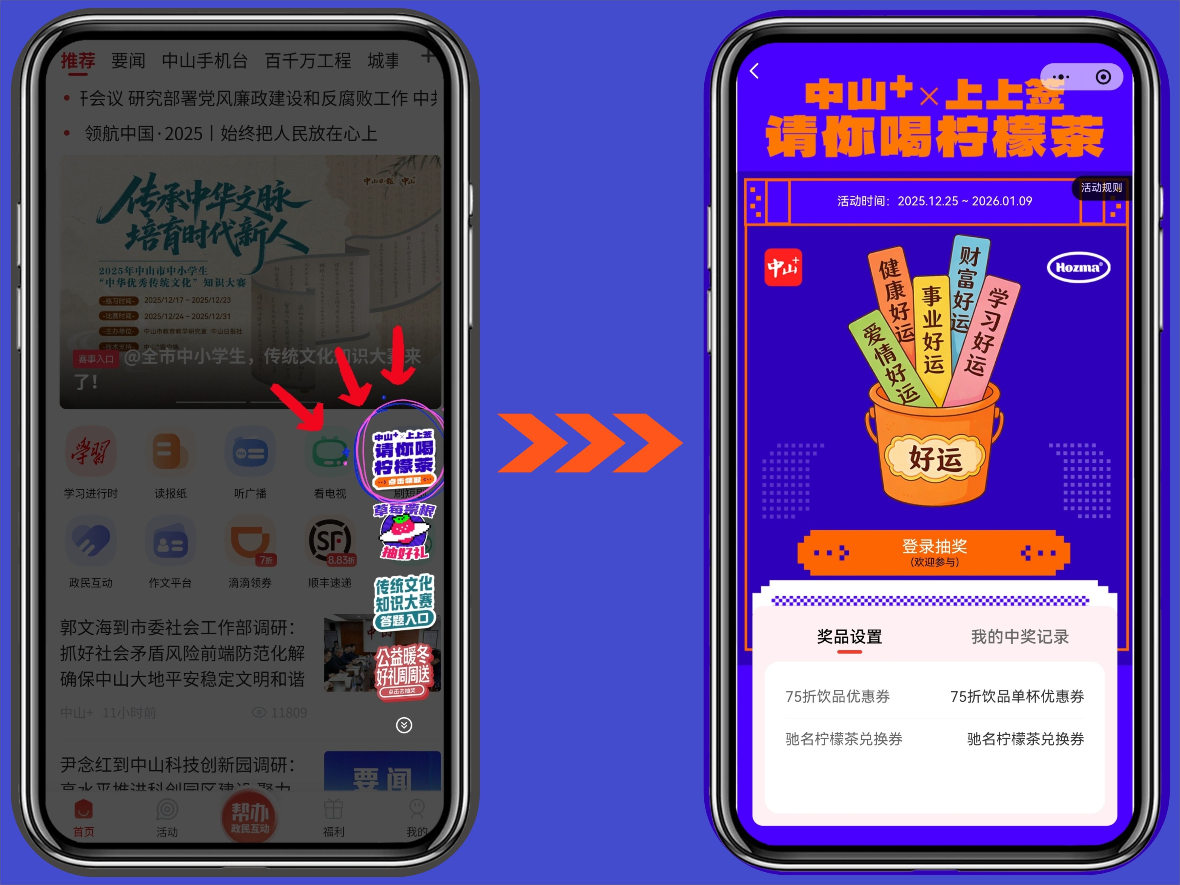 2.打开“中山+”客户端,在首页点击“请你喝柠檬茶”浮标进入活动页面,选择具体的店铺去抽奖。