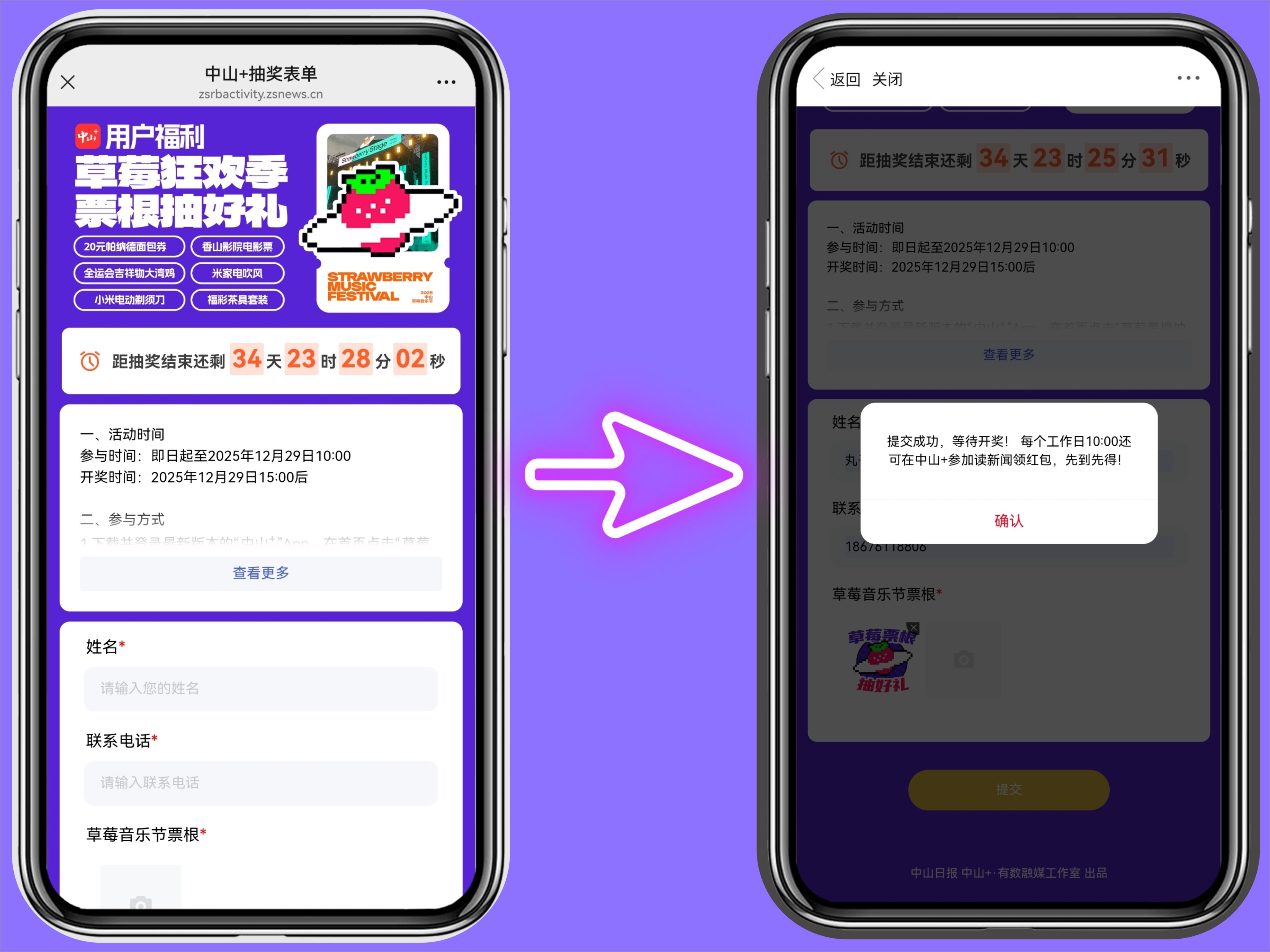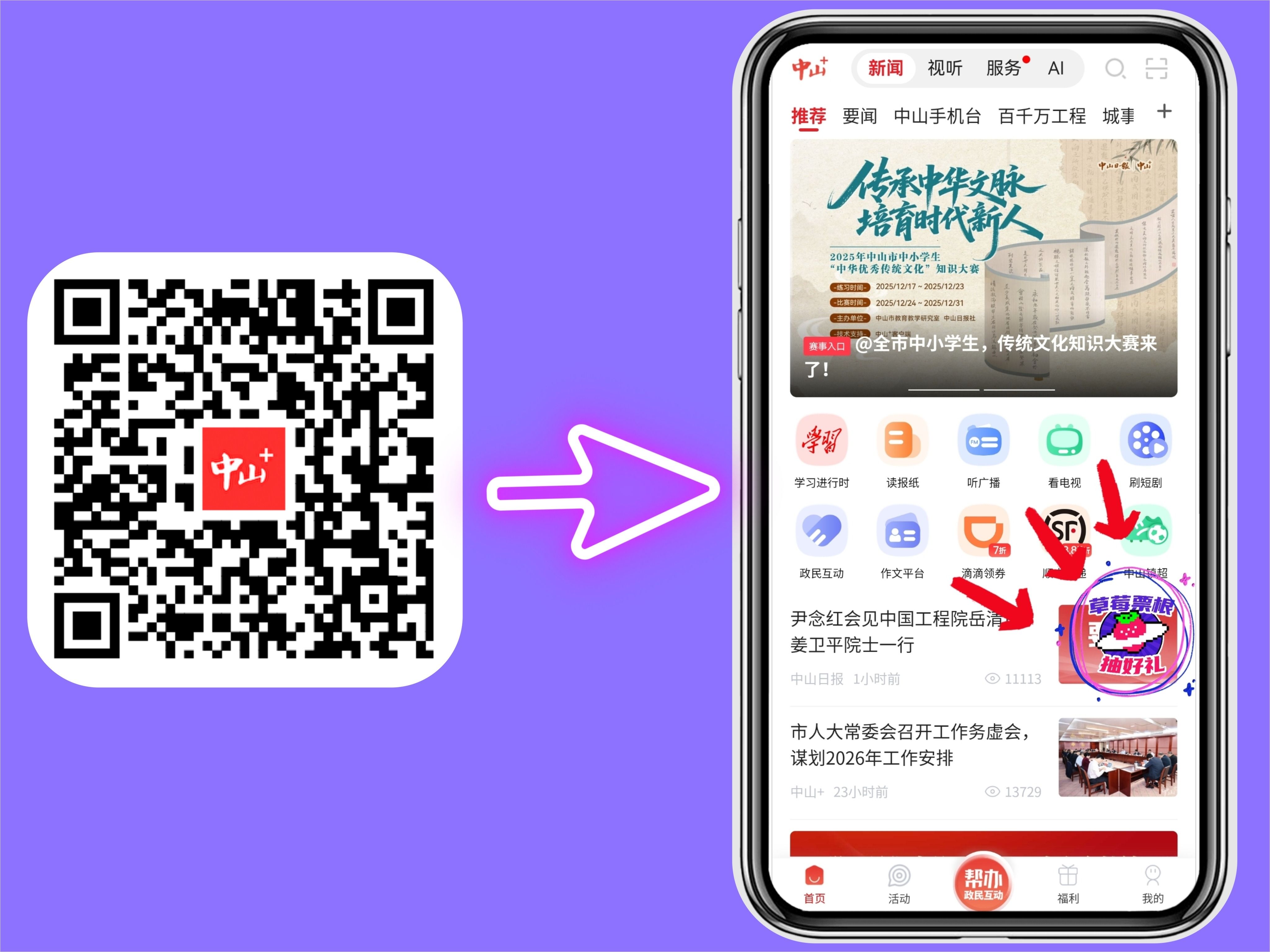 ①扫码下载“中山+”客户端。安装完成后,打开App进入“新闻首页”点击“草莓票根抽好礼”浮标进入活动页;