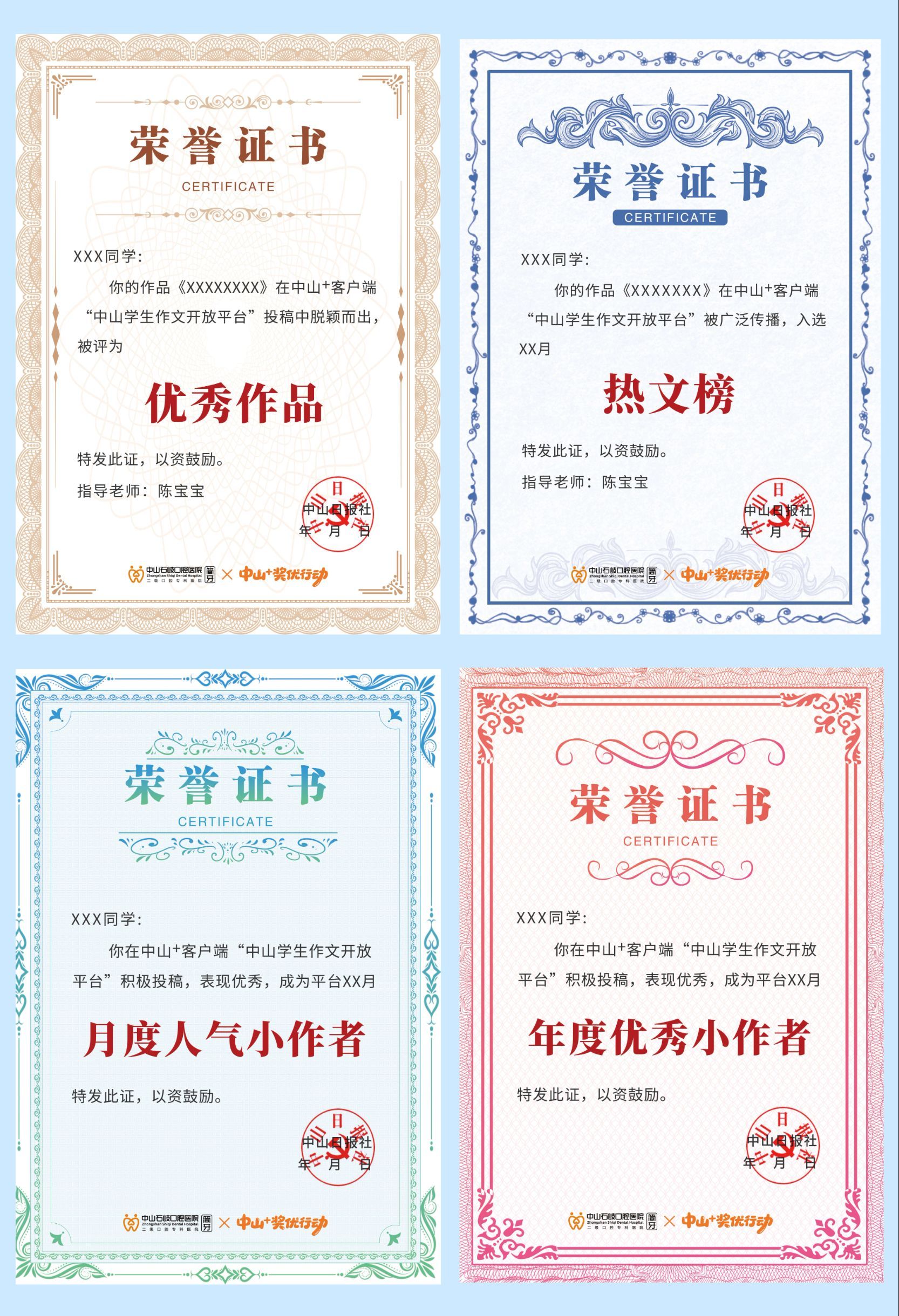 ▶分层奖励机制,优秀作品可获稿费+证书。所有文章公开展示的同时,编辑老师会持续甄选优秀作品,推荐至“中山+”教育频道。稿件一旦被“精选”或被频道采用,小作者就可以获得证书/证书+稿费奖励,给你满满的成就感!