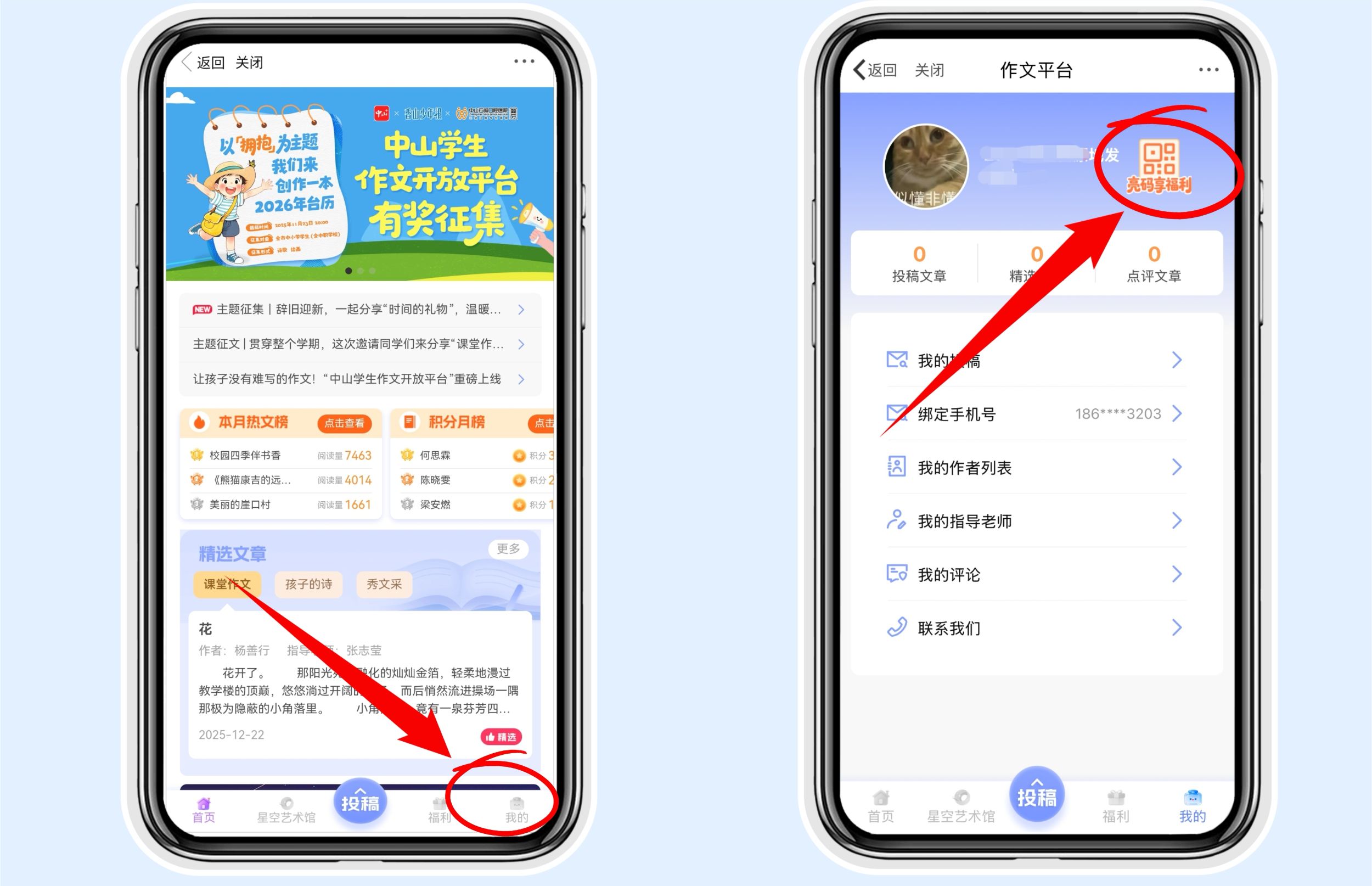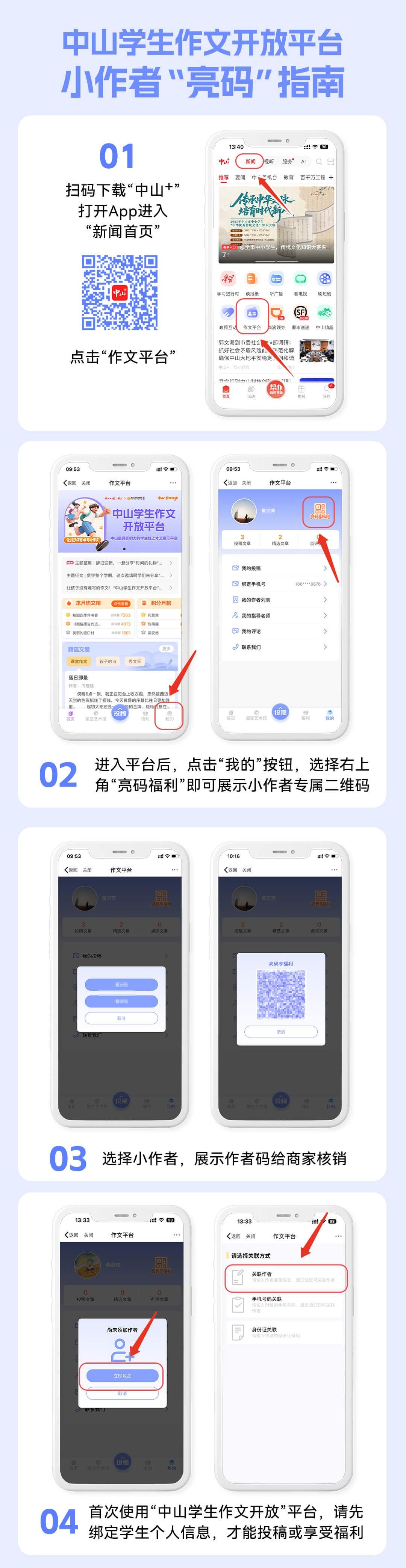 入驻“中山学生作文开放平台”只需3步。成功绑定小作者信息后,即可向我们投稿或领取专属福利:
