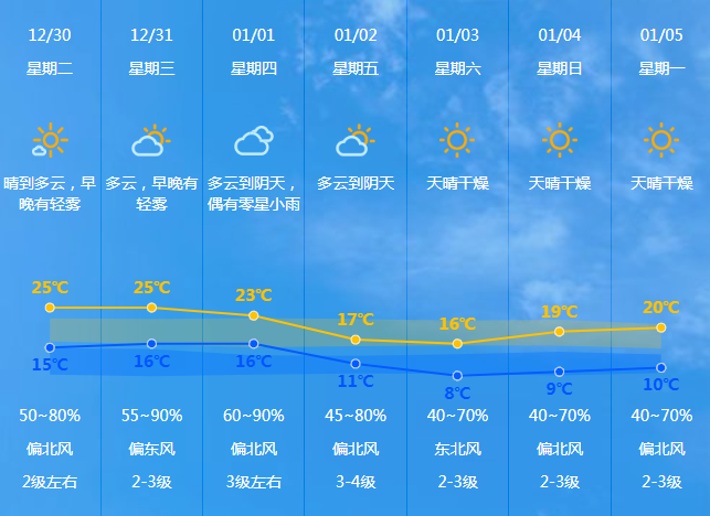 12月30-31日,中山晴到多云,白天气温逐步回升,昼夜温差大,早晚寒凉,请注意适时添减衣物。