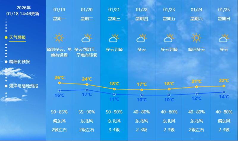 至于中山情况,1月21日起我市将迎来一次较大的降温,最高温度将跌至17℃,最低温度将跌至10℃,1月24日起,气温将缓慢回升。