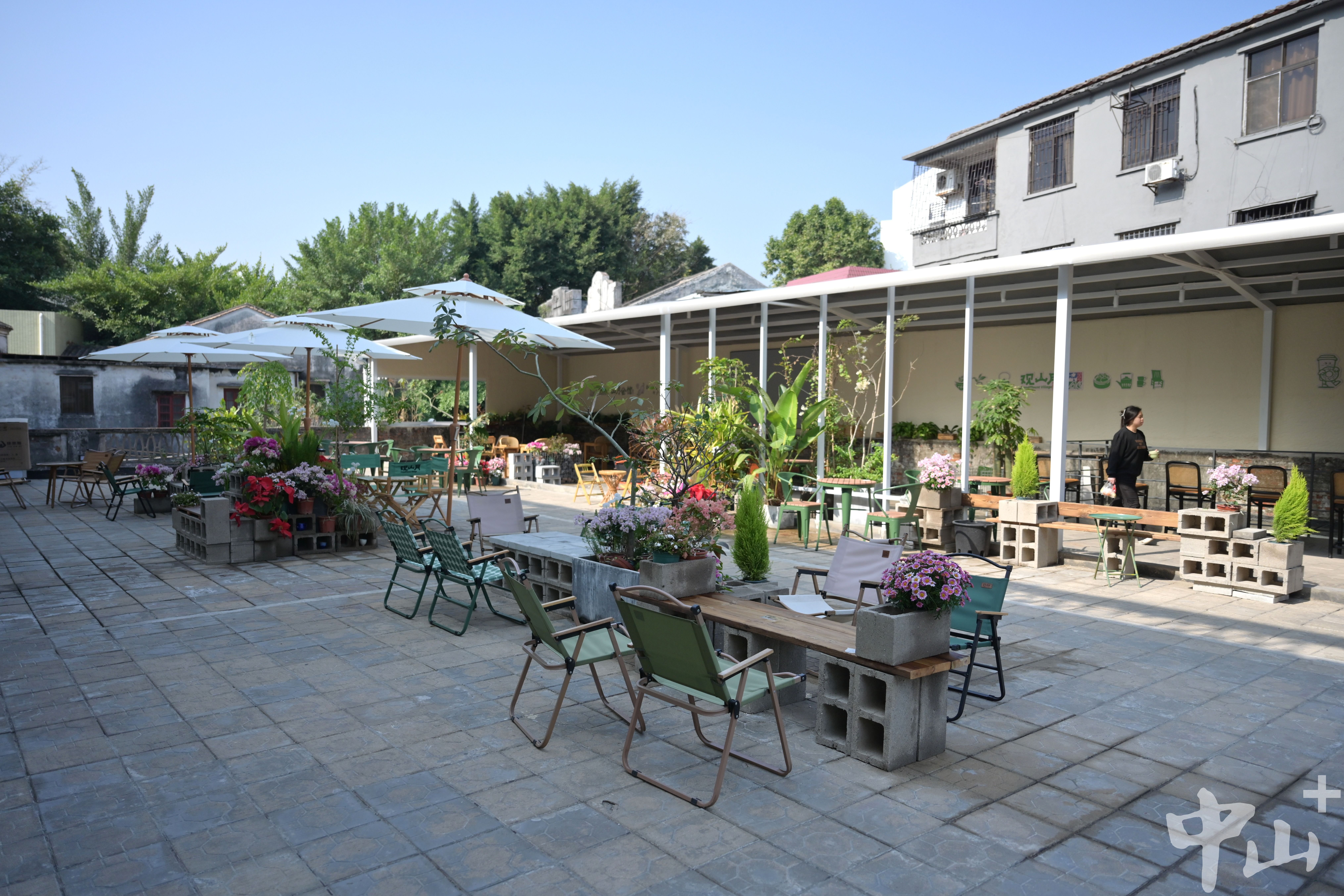 桂咖啡坐落在一栋有着百年历史的老建筑里。这里曾是“郭氏大祠堂”,后来一度荒废。2024年底,中山城建集团将这座老宅的主体结构加固,保留了石柱、雀替、卯榫结构的巨大木梁,老宅重现芳华。徐棣禧接手的时候,这里是毛坯的,只有建筑框架。没有请设计师,他和伙伴自己构思设计,保留了旧时的青砖,找来了老瓦片,在旧框架里“轻装”,既保留岭南风情,又填充进现代生活的温度。