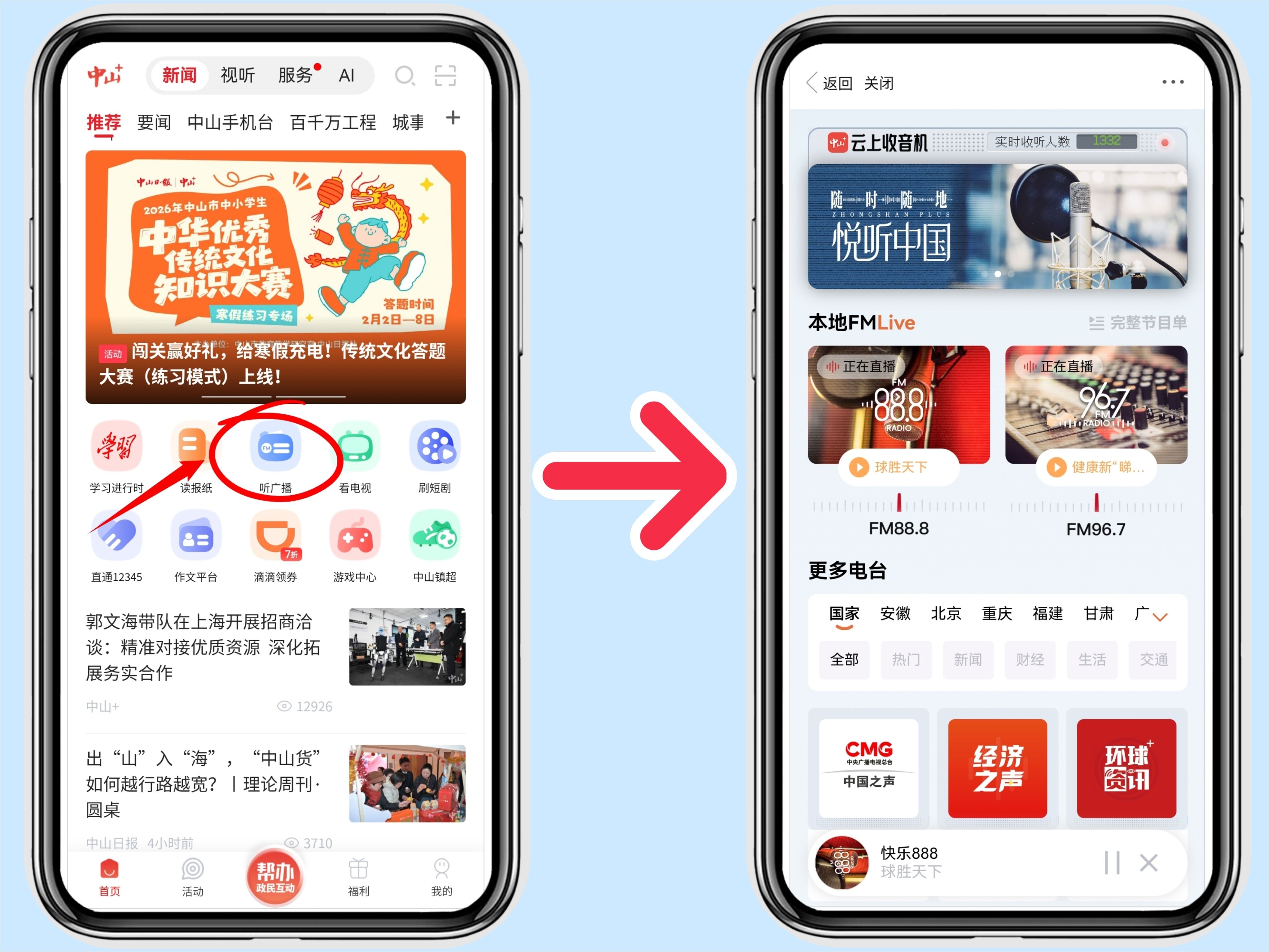 进入“中山+”首页,点击听广播按钮即可实现“随身听”↓