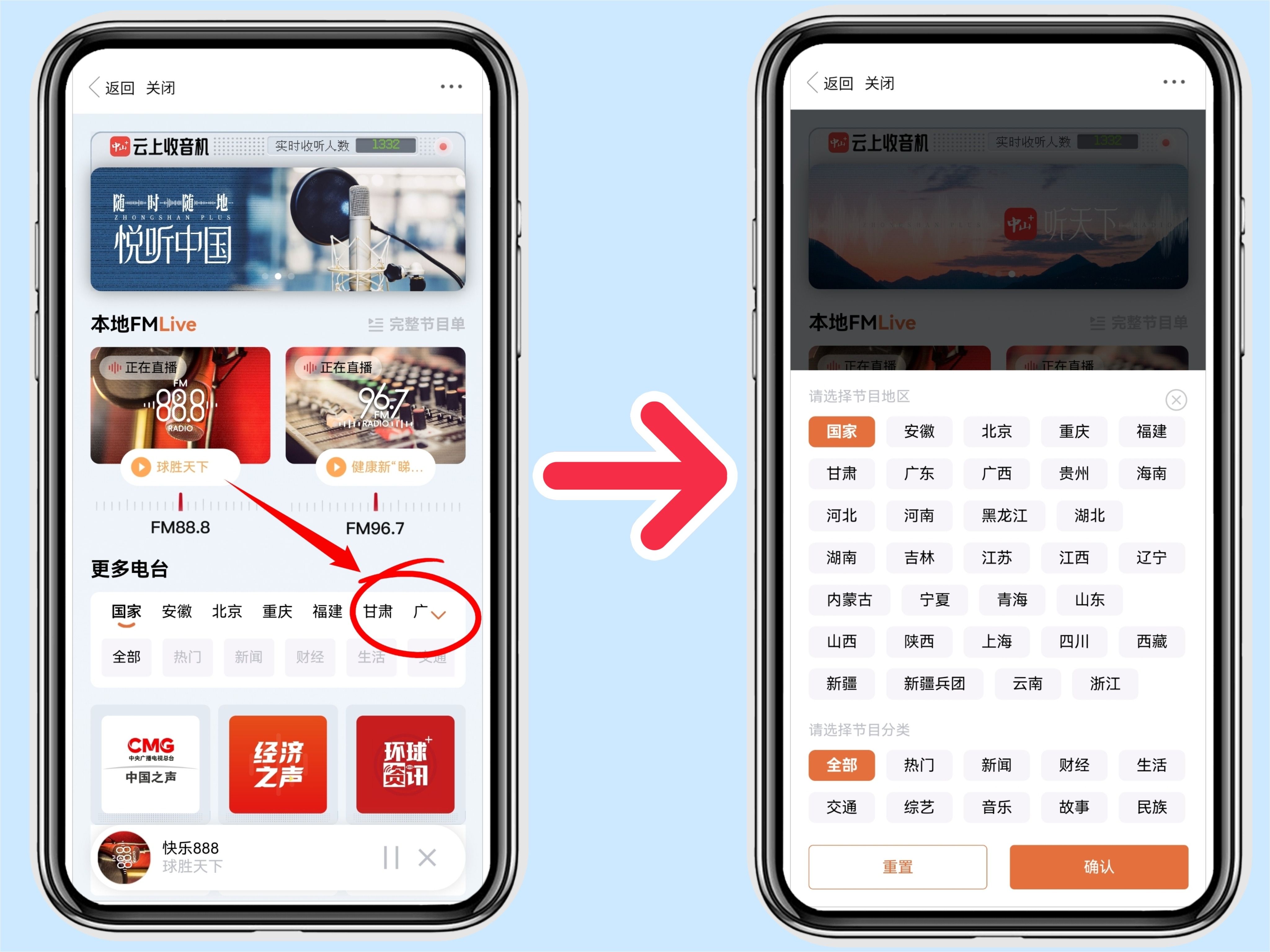 ▶全国电台,任听随心。新增覆盖全国的官方主流广播电台,无论是热门的《中国之声》《环球资讯广播》《音乐之声》还是各省份的新闻资讯、热门综艺,甚至英语资讯广播、老年之声、藏语广播等等,都能实现随时随地随身听!