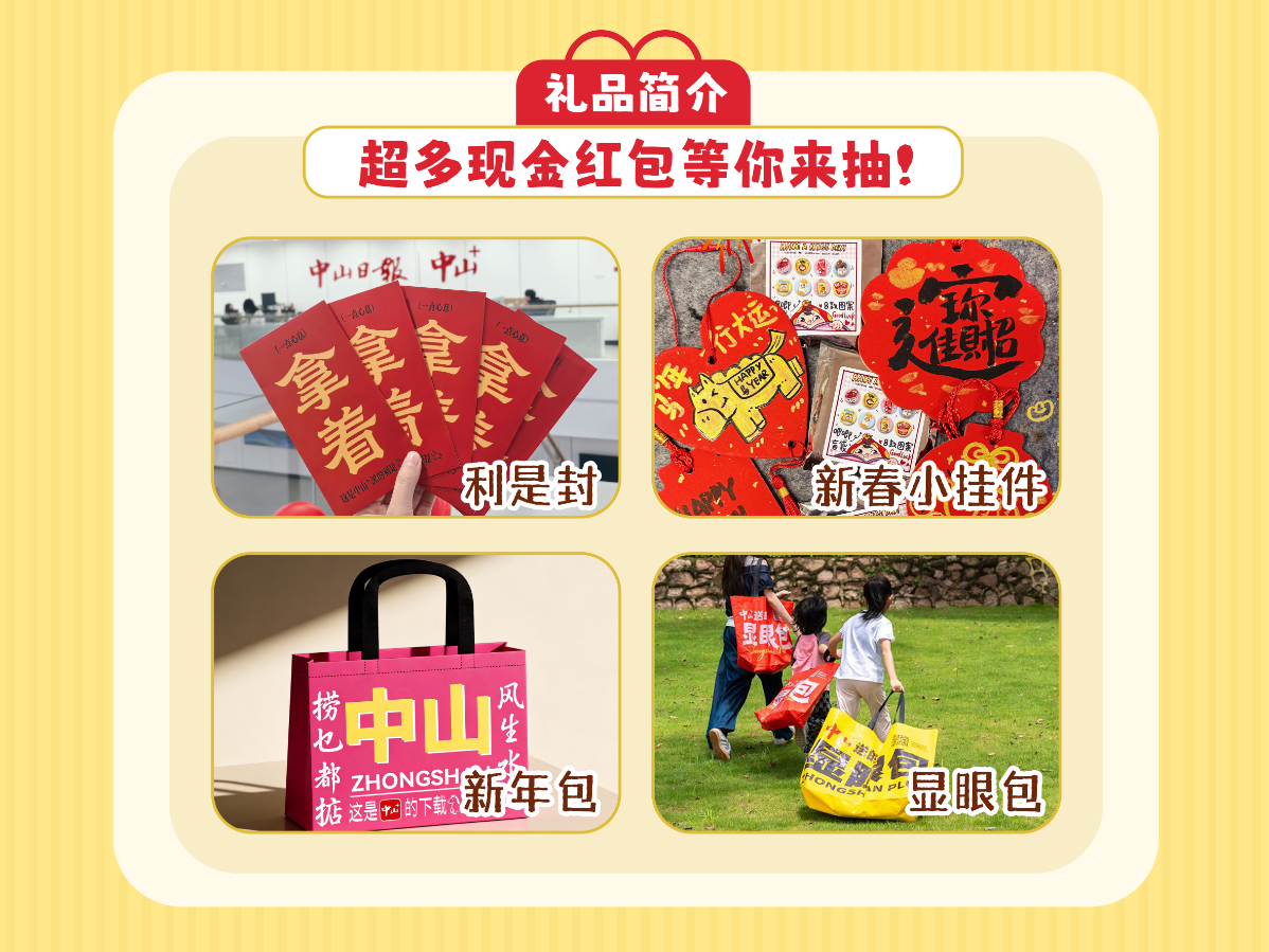 ▶见面即有礼:在花市现场找到“中山+”摊位,扫码就能参加抽奖,且百分百中奖。奖品包括为大家定制的新年文创包、新年利是封、随机现金红包以及火爆全城的“中山+”显眼包。
