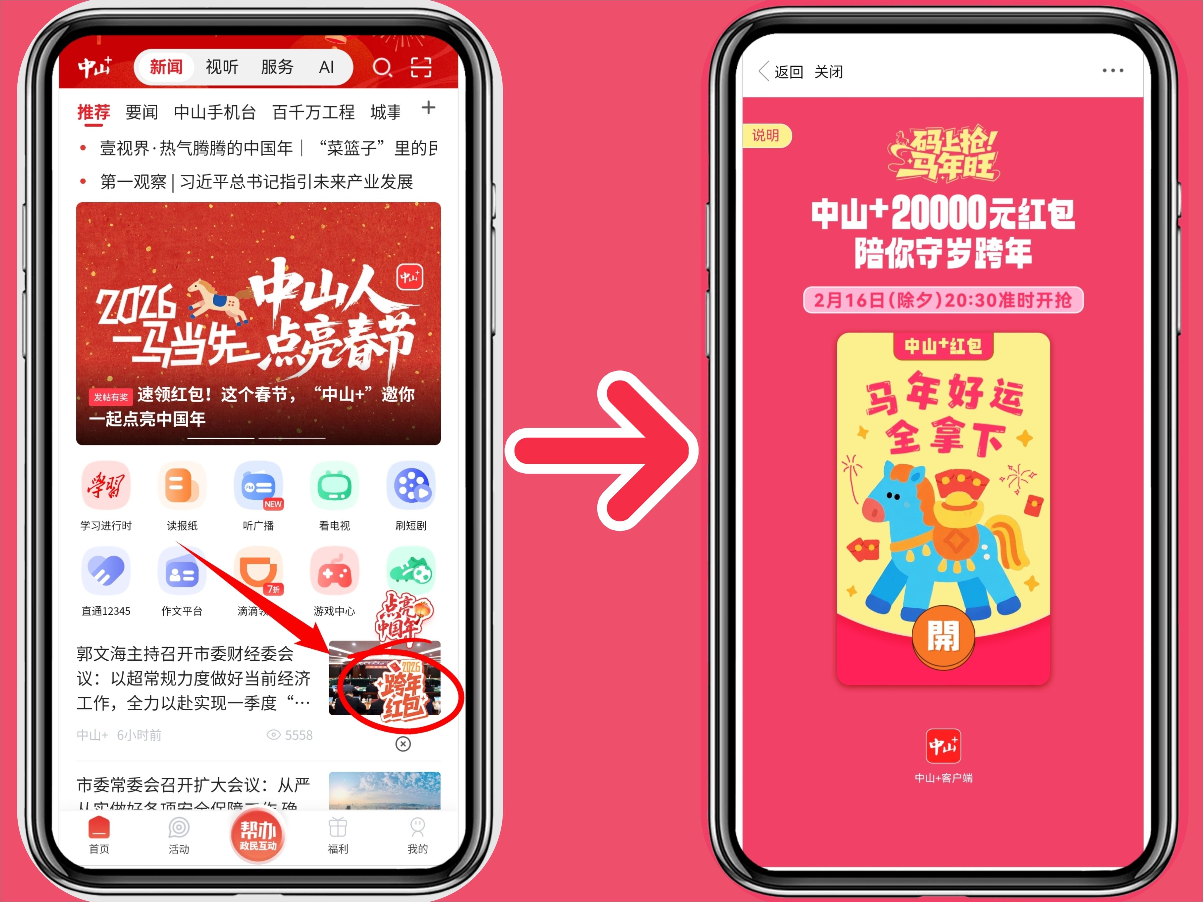 ② 下载完成后,打开“中山+”App,点击新闻首页“跨年红包”浮标进入活动页面,到点开抢。