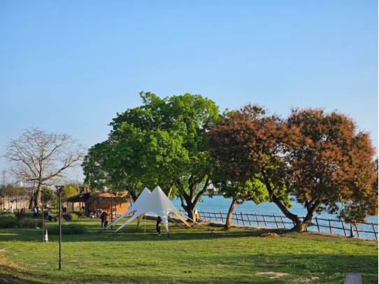 过桥便是海口粮仓。目前草坪咖啡厅正加紧施工,计划五一假期正式对外开放。届时,游客可以坐在宽阔的江边品咖啡,四周绿植环绕,充满自然野趣。