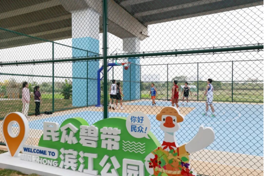 这片桥下空间总面积7600多平方米,过去杂草丛生、地面坑洼、雨季容易积水。作为民众街道首个桥下空间提升利用试点项目,碧带滨江公园践行了“百千万工程”与城市“微更新”理念,既盘活了闲置资源,又为周边沿江、接源等村民打造了“家门口的运动场”。