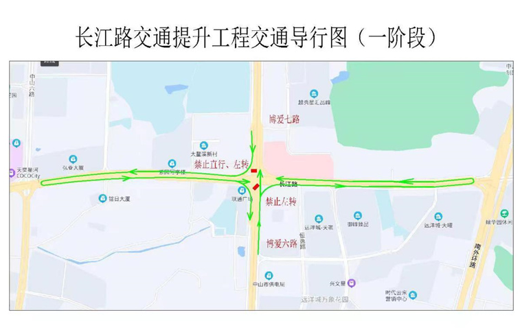 8月13日至8月22日,由博爱六路左转前往长江路北段方向的机动车辆,可在博爱路路口右转行驶至长江路南段调头前往,摩托车仍可按原路线通行;由博爱七路经辅路前往博爱六路及左转前往长江路南段方向的机动车,可在博爱路路口右转行驶至长江路北段调头前往。