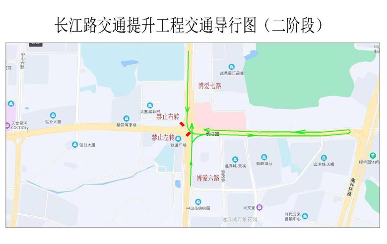 8月22日至8月31日,由博爱六路前往长江路北段方向的机动车辆,可在博爱路路口右转行驶至长江路南段调头前往,摩托车仍可按原路线通行;由博爱七路前往长江路北段的机动车辆,可左转驶入长江路南段调头前往,摩托车辆仍可按原路线通行。