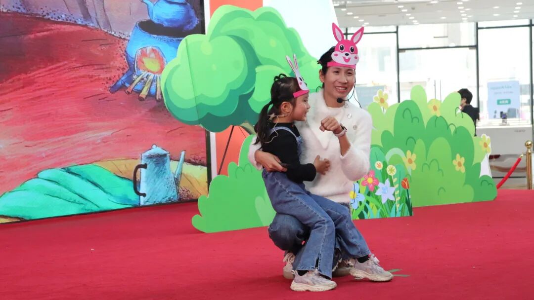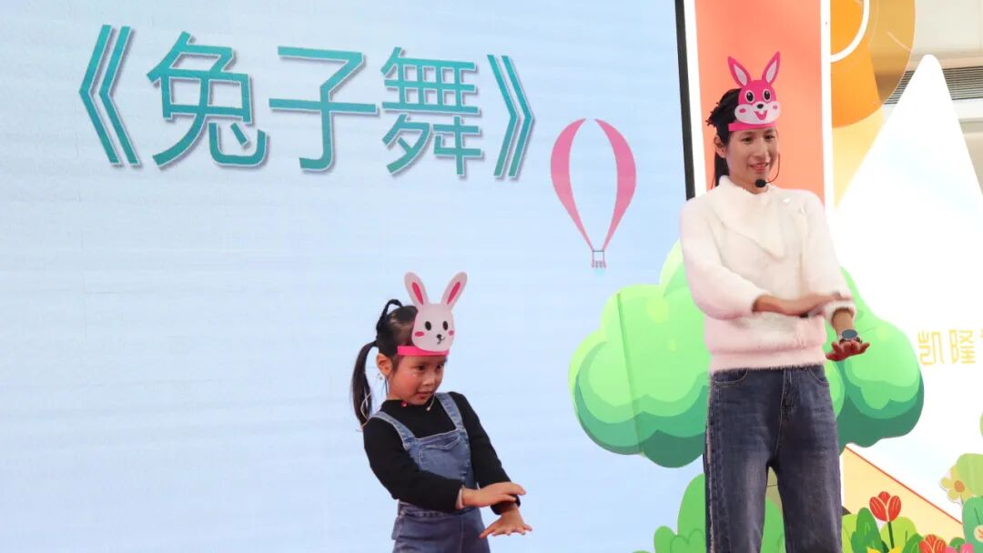 一对亲子家庭表演了绘本剧《逃家小兔》,通过肢体动作与道具使用走进角色,获取真切的故事体验。亲子共同演绎的绘本剧犹如一把神奇的钥匙,让父母和孩子共同打开了一扇通往智慧和快乐的大门,结束后,他们表演舞蹈《兔子舞》,台下小朋友也跟着一起跳。