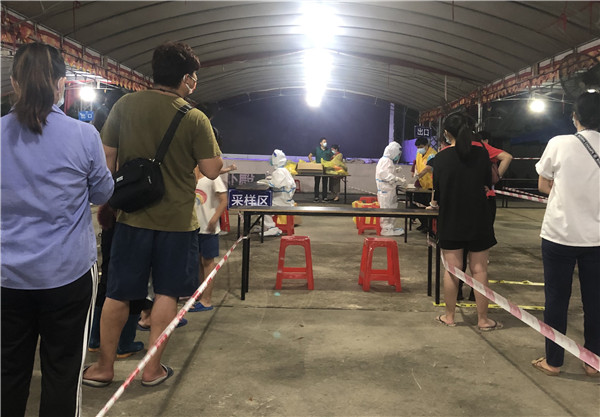 22日23时,坦洲镇嘉德花园广场核酸检测点已有群众前来排队等候检测。现场集结了7名医务人员,许多教师、社区党员、群众、退役军人报名当志愿者,迅速启动了该检测点的检测工作。