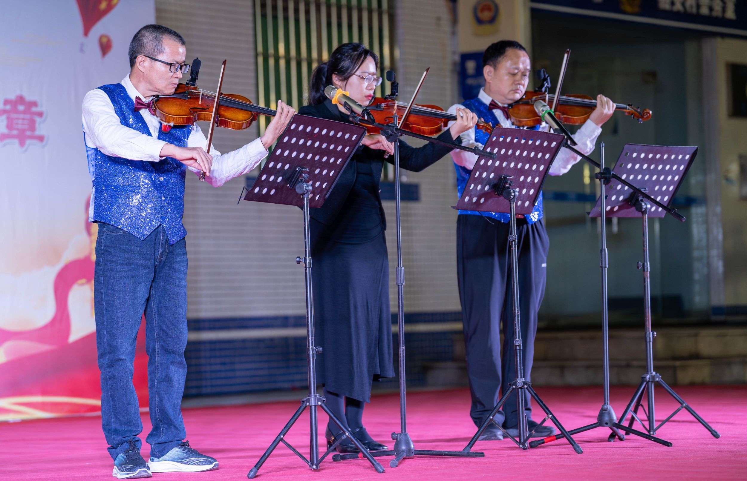 当晚,随着民乐社团激昂奏响《我的祖国》,汇演正式拉开帷幕。舞台上,裕安村文艺队伍与火炬科校师生同台献艺,12个节目轮番登场,涵盖民乐合奏、弦乐表演、舞蹈、朗诵等形式。民合舞蹈队的《祝福祖国》大气磅礴,渔村舞蹈队的《我爱美丽的中国》灵动欢快,裕安舞蹈队的《中国美草原美》以优美舞姿展现民族风情,共同抒发对祖国的深情礼赞。