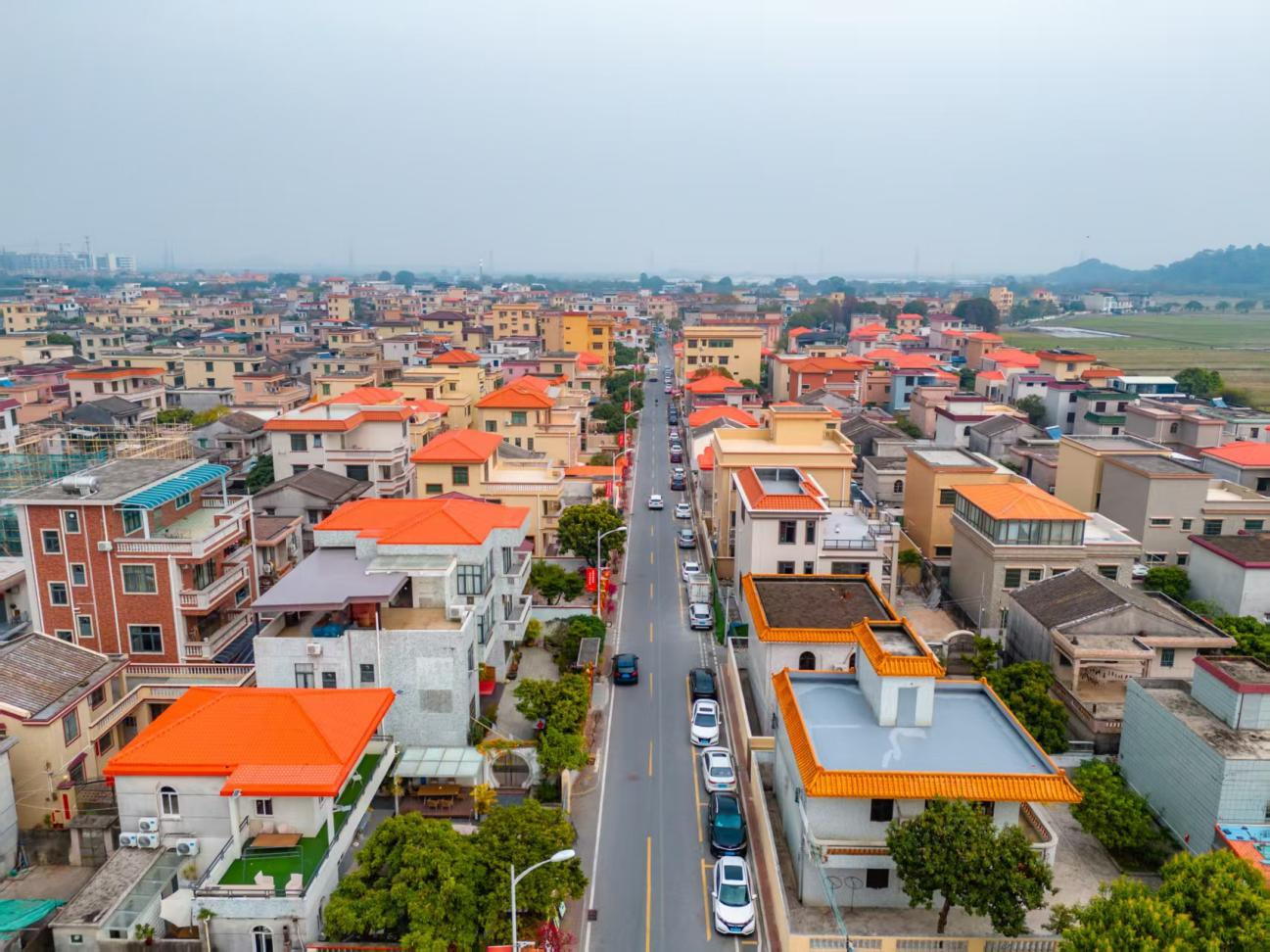 在项目推进过程中,翠亨建工创新推行“三统一、三同步”模式,通过统一设计、统一采购、统一施工优化资源配置,同步推进房屋改造、环境清杂与设施完善,实现人居环境全域提升。同时,项目坚持“不搞千村一面,彰显地域特色”原则,依托本土设计力量编制技术导则,采用哑光橙色为主、蓝灰色为辅的坡屋顶色彩体系,既保证沿线视觉统一连贯,又与自然环境和谐相融。针对不同农房现状,施工团队精准实施平改坡、增设披檐、外墙翻新等差异化改造,让老房子焕新颜的同时,留住浓浓乡愁。