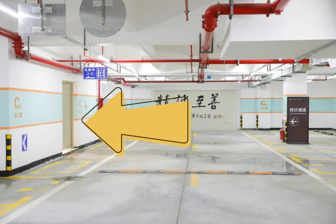 景观大道隧道口处可直接进入负二层停车区,根据现场指示牌前往电梯厅,乘电梯前往1层往治未病中心(体检中心)& 2层针推康复科门诊