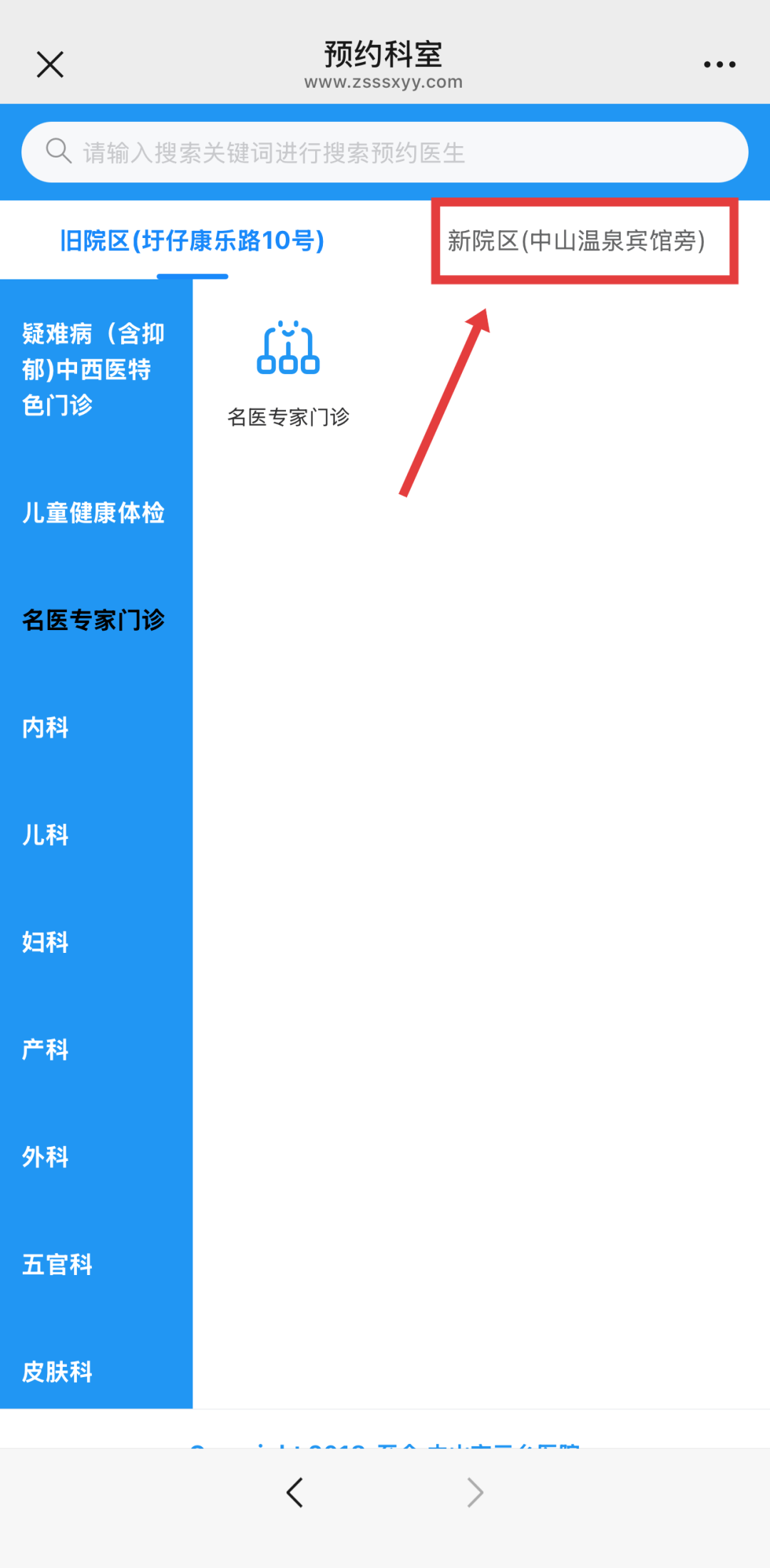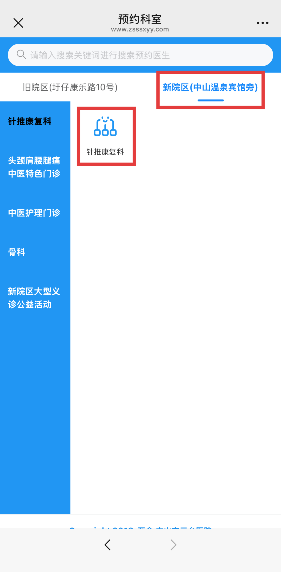 ② 点击“新院区(中山温泉宾馆旁)”栏目,选择“针推康复科”