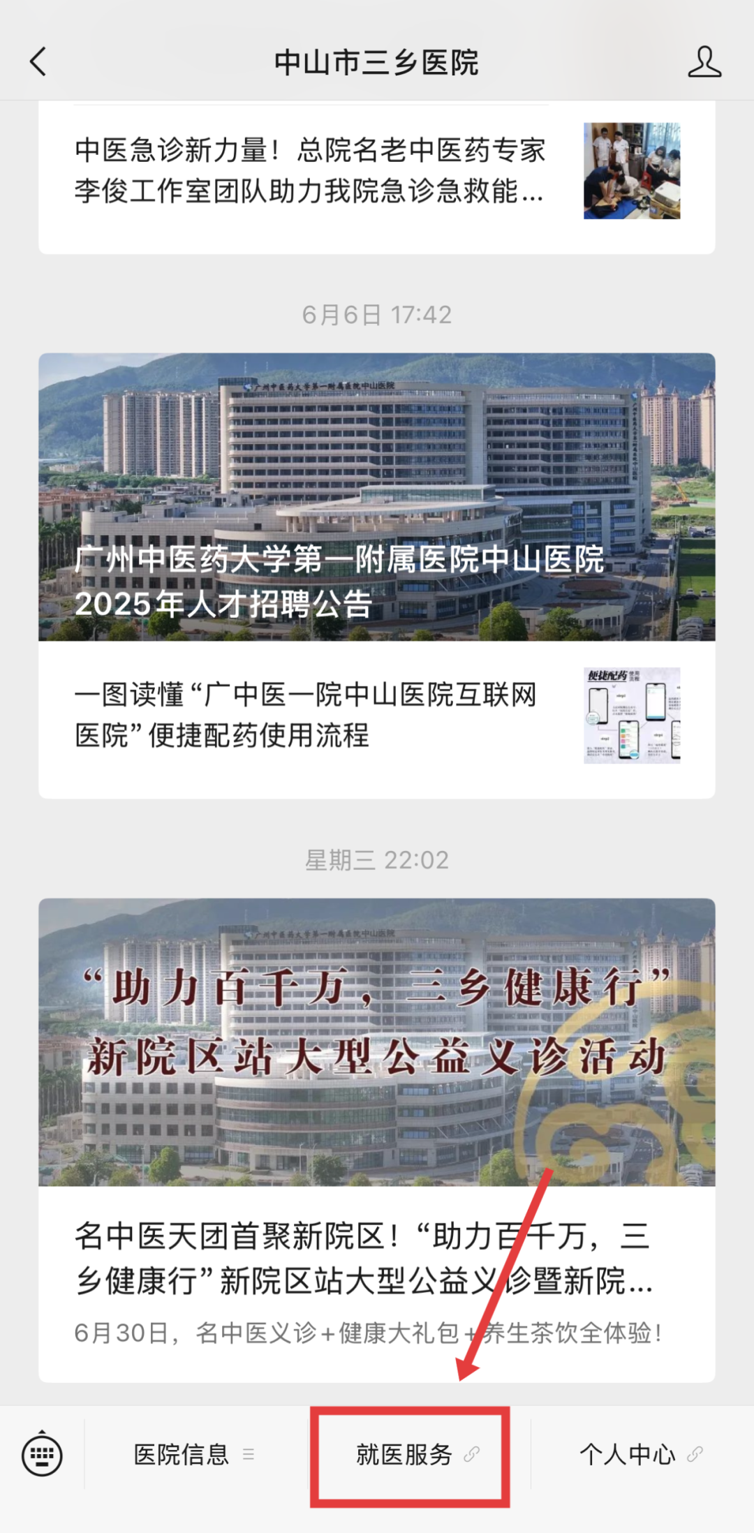 ① 进入医院微信公众号界面,在菜单栏点击“就医服务”进入预约系统,选择“预约挂号”