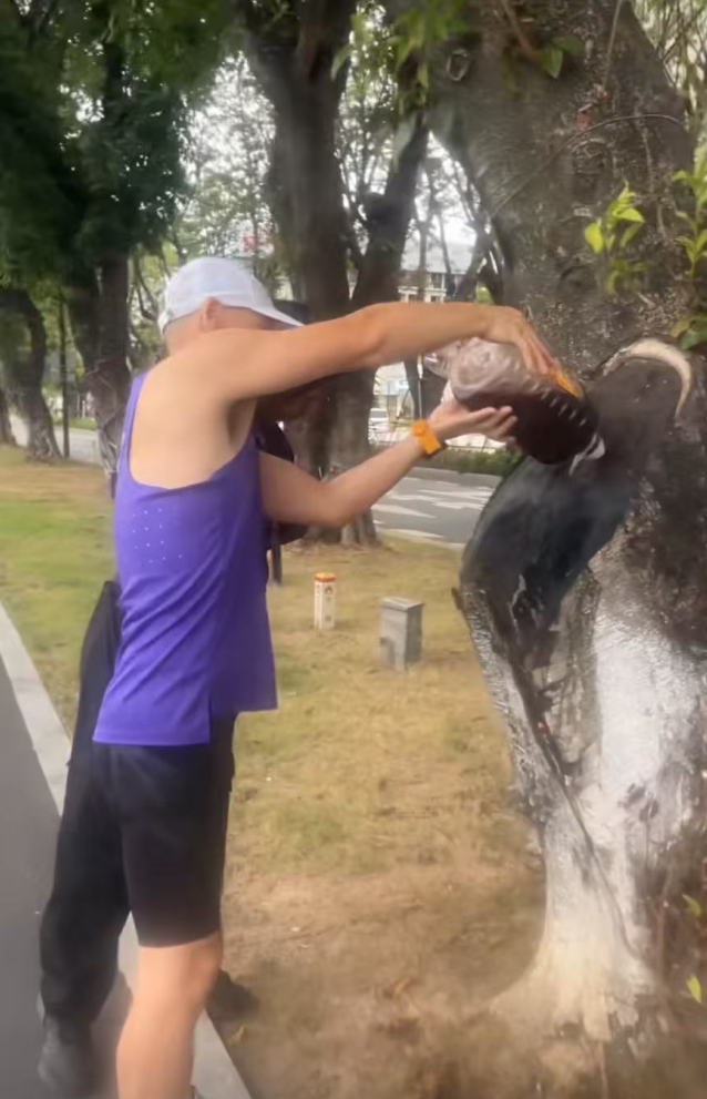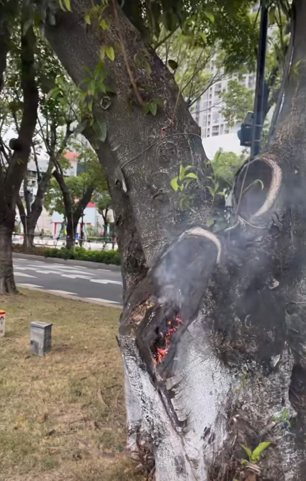 深秋时节,天干物燥,正是防火关键期。近日,早上7时许,“一河两岸”龙舟巡逻保安队员像往常一样巡查时,发现青溪路一棵树木内部竟冒出火光,且火势有扩大迹象!