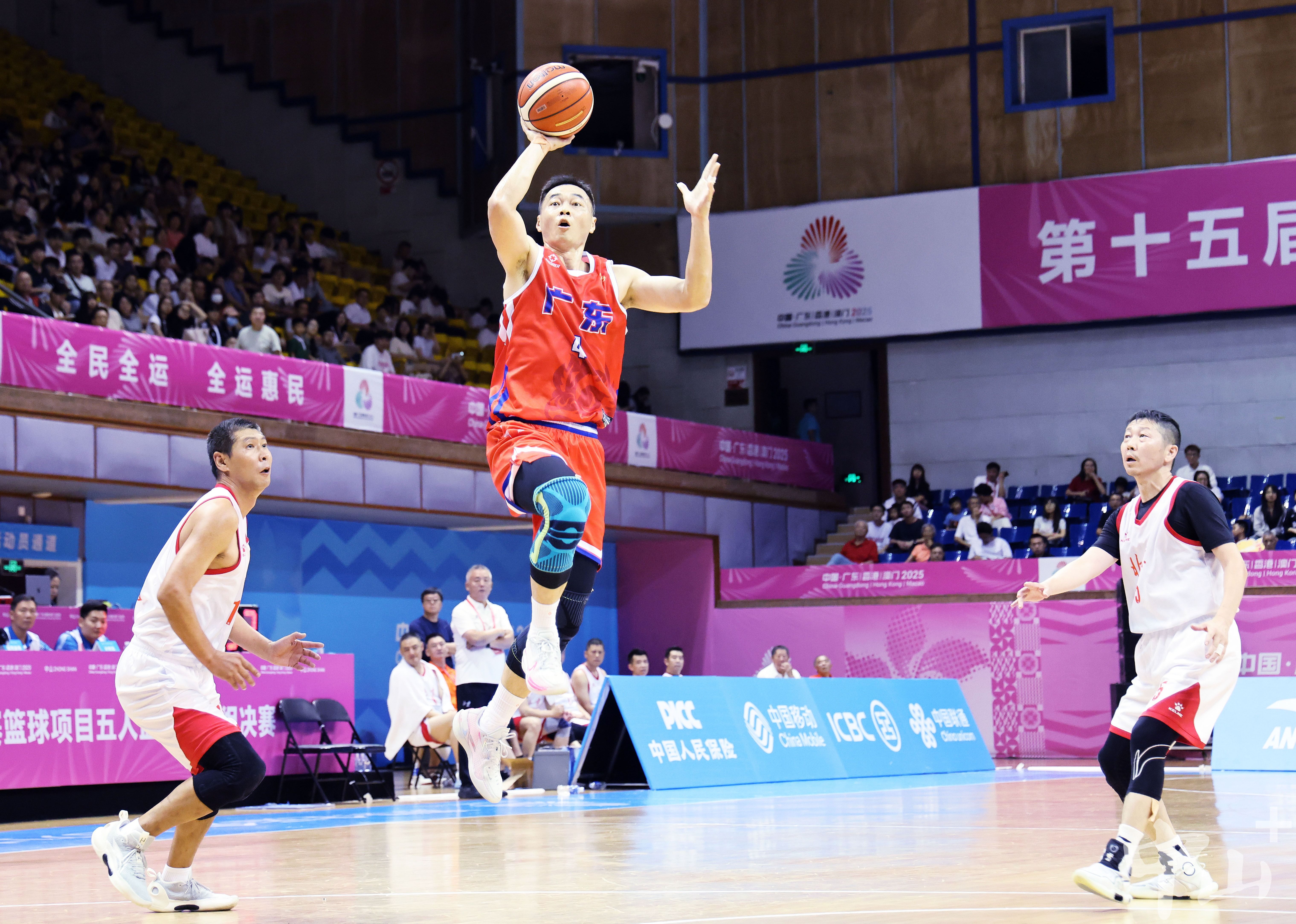 9月6日18时35分,中山市沙溪体育馆内人声鼎沸,第十五届全国运动会群众篮球男子组A组(25-34岁)正在比赛。记者 文波 摄