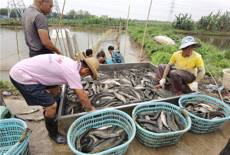 据介绍,乌斑杂交鳢也就是我们经常说的生鱼。三角镇养殖生鱼有近40年历史,经过多年发展已形成了集苗种生产、成鱼养殖、流通和加工一条龙的成熟的产业链。目前,该镇生鱼养殖面积约1万亩,每年生产生鱼8万吨,年产值超过11亿元。三角镇已成为全国重要的杂交生鱼苗种生产地,每年生产并销往全国各地的杂交生鱼苗、鱼种超过40亿尾,占全国杂交生鱼苗种市场60%份额。全镇生鱼全产业链年产值超过13.5亿元,已成为三角农业的支柱产业。