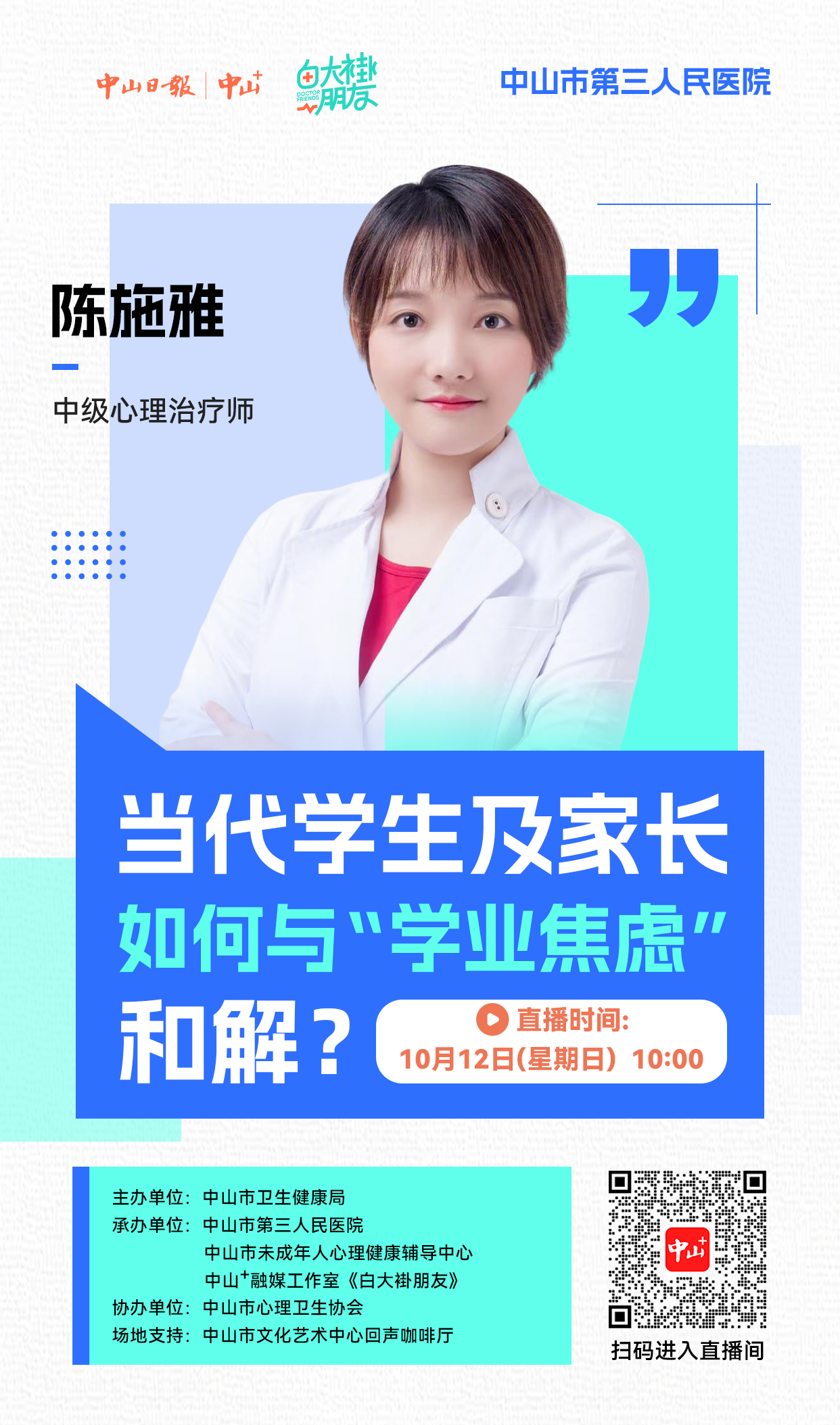 如何观看直播?扫描下方海报二维码,即可进入直播间~~~10月12日周日上午10点,听听心理医生分享如何与“学业焦虑”和解,我们不见不散!