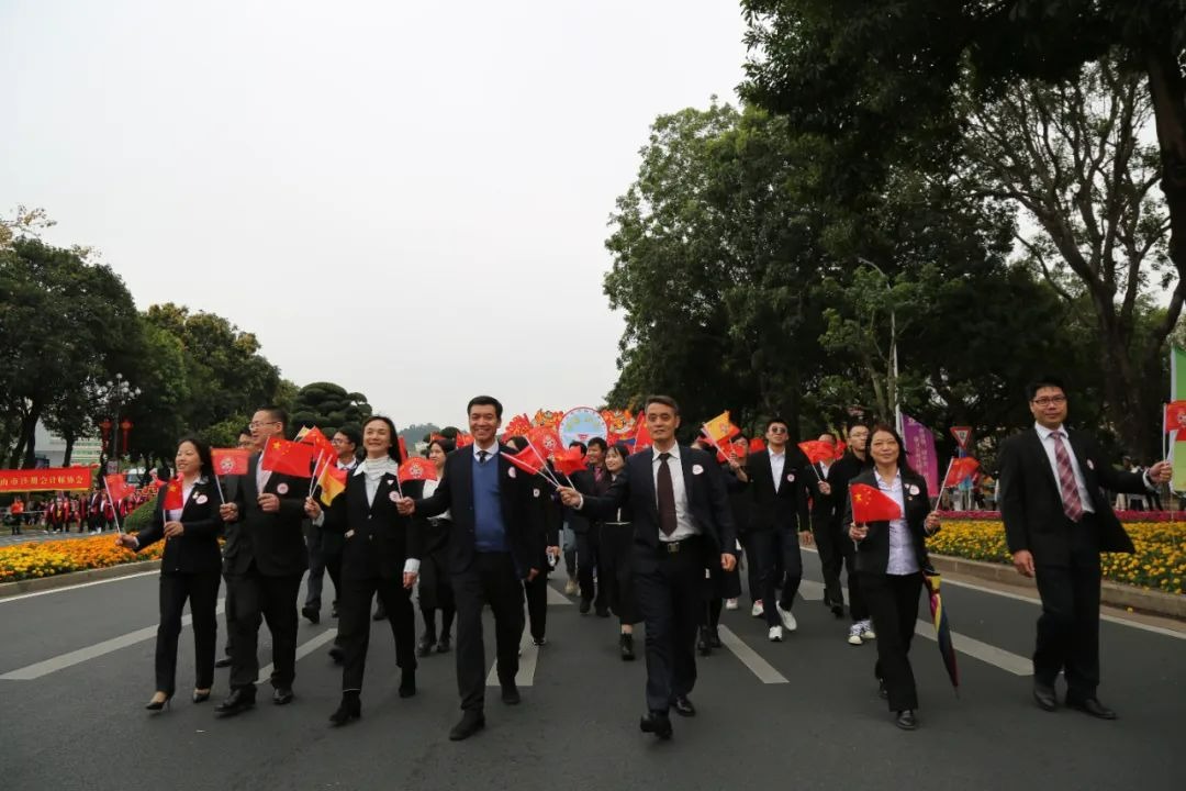 中山实中党委书记杨荣浩,校长刘朝晖带领教师方队,伴随《我们与爱同行》的旋律,沿着兴中道向答谢台行进。教师方队有颜值有活力有激情,他们挥舞着小国旗,热情大方着向路边的群众挥手致意,向社会各界展示了中山实中人饱满的精神面貌与和谐的团队精神,诠释着中山人的慈善文化。
