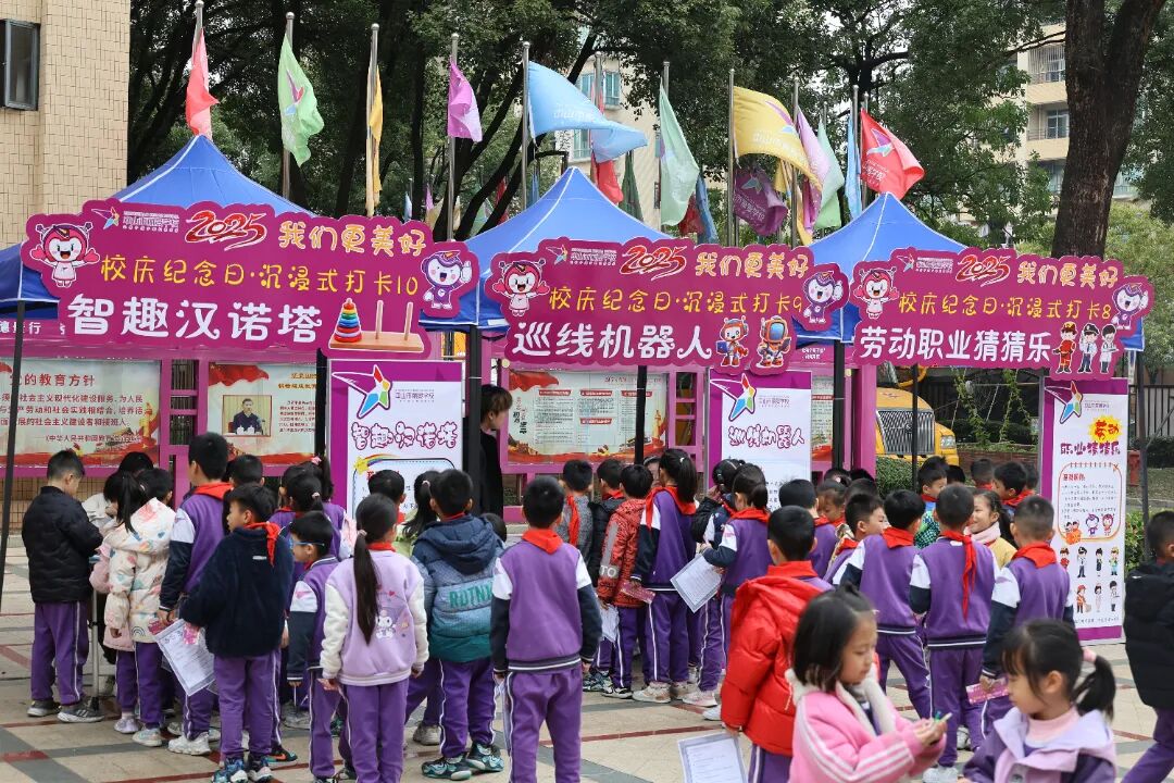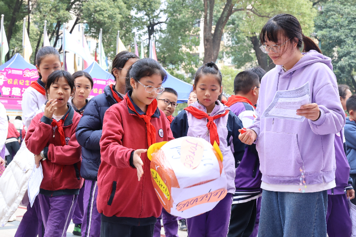 活动现场,每个摊位都代表着学校的一种文化或教育理念,孩子们穿梭在各摊位间,了解校史,重温校徽、一训三风的内涵,参与游戏的同时加深对校园文化了解,感受到传承闪亮文化的责任与担当。
