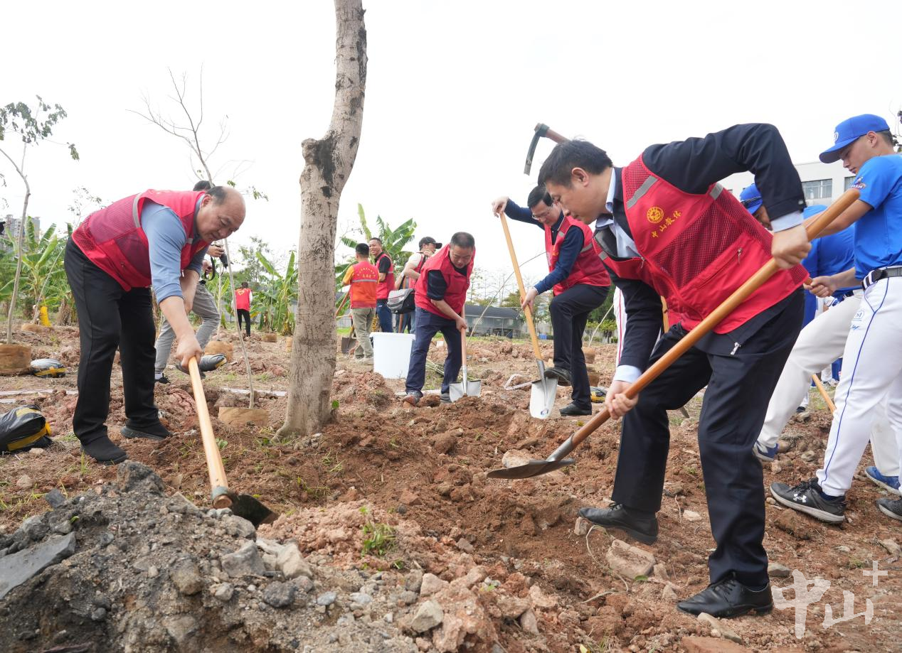 大家分工协作,三两一组,挖坑铲土、扶苗平整、挥锹压实、提水浇灌,齐心协力种下凤凰木、黄花梨等树种共200余株,共植“零碳全运林”。