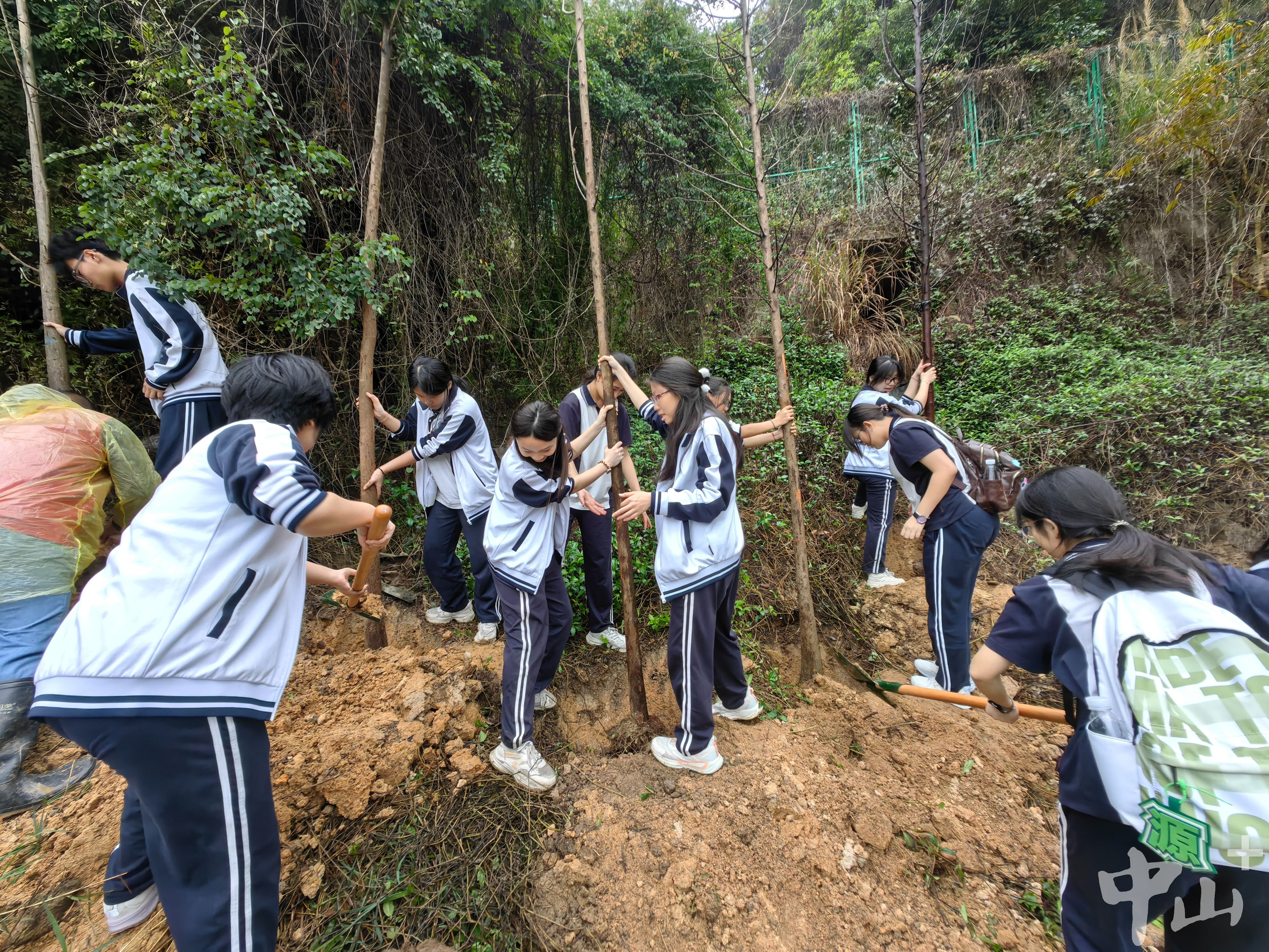 当天上午,现代职校信息部党支部组织了50余位党员教师、团员代表及学生志愿者,前往三乡古鹤村进行义务植树。活动过程中,师生们发扬不怕苦、不怕脏、不怕累的精神,尽管天空不时飘落零星小雨,且山路崎岖不平,但他们植树的热情不减,路不好走就互相搀扶,树苗重则合力搬抬,大家齐心协力地挖坑铲土、扶苗平整、挥锹压实、提水浇灌,将一株株树苗精心栽种,经过一个多小时的劳动,近百株新苗错落挺立于山坡,与碧水蓝天相映成趣。