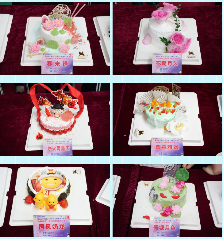 其中,2024级烹饪5班的欧芷因、何蔓儿、钟文诗创作的“素瓷甜笺”蛋糕,巧妙运用食用色素勾勒出青花纹样,让瓷器的韵味在奶油胚体上流转;同班尹洧琳、罗若兰、甘婷婷同学制作的“柿柿如意”蛋糕,借助翻糖工艺塑造出霜柿的造型,寓意事事顺遂的美好愿望;而2024级电器2班的邓雨樱、李颖欣、黄浩博则创作了名为“荷塘月色”的蛋糕,以薄荷慕斯营造出莲叶连绵的朦胧意境,展现了非遗技艺的当代风采。