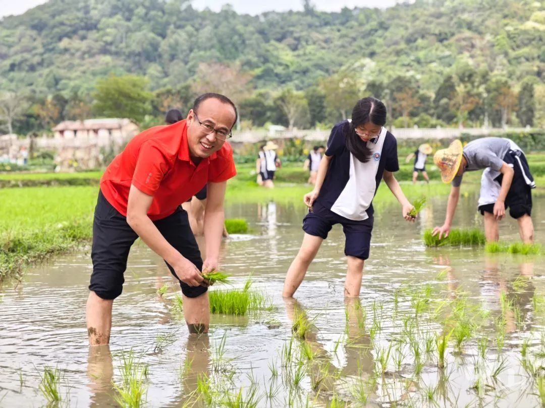 该校信息部党支部设立了“党员责任田”,并组建5支党员+团员帮扶小组。有着插秧经验的党员教师文盈旗带头示范,手把手教授分秧、插苗技巧,并耐心指导:“分秧要均匀,插秧要浅直,间距要适中。” 师生们挽起裤脚躬身实践,从踉跄不稳到渐成行列,在协作中体验到“脚下沾泥,心中有情”的意义。学生王凤岚感慨:“以前只知粒粒皆辛苦,今天才懂其中深意。”