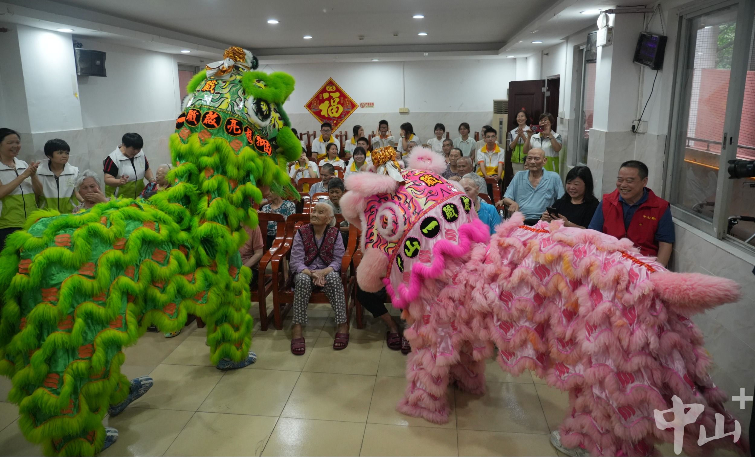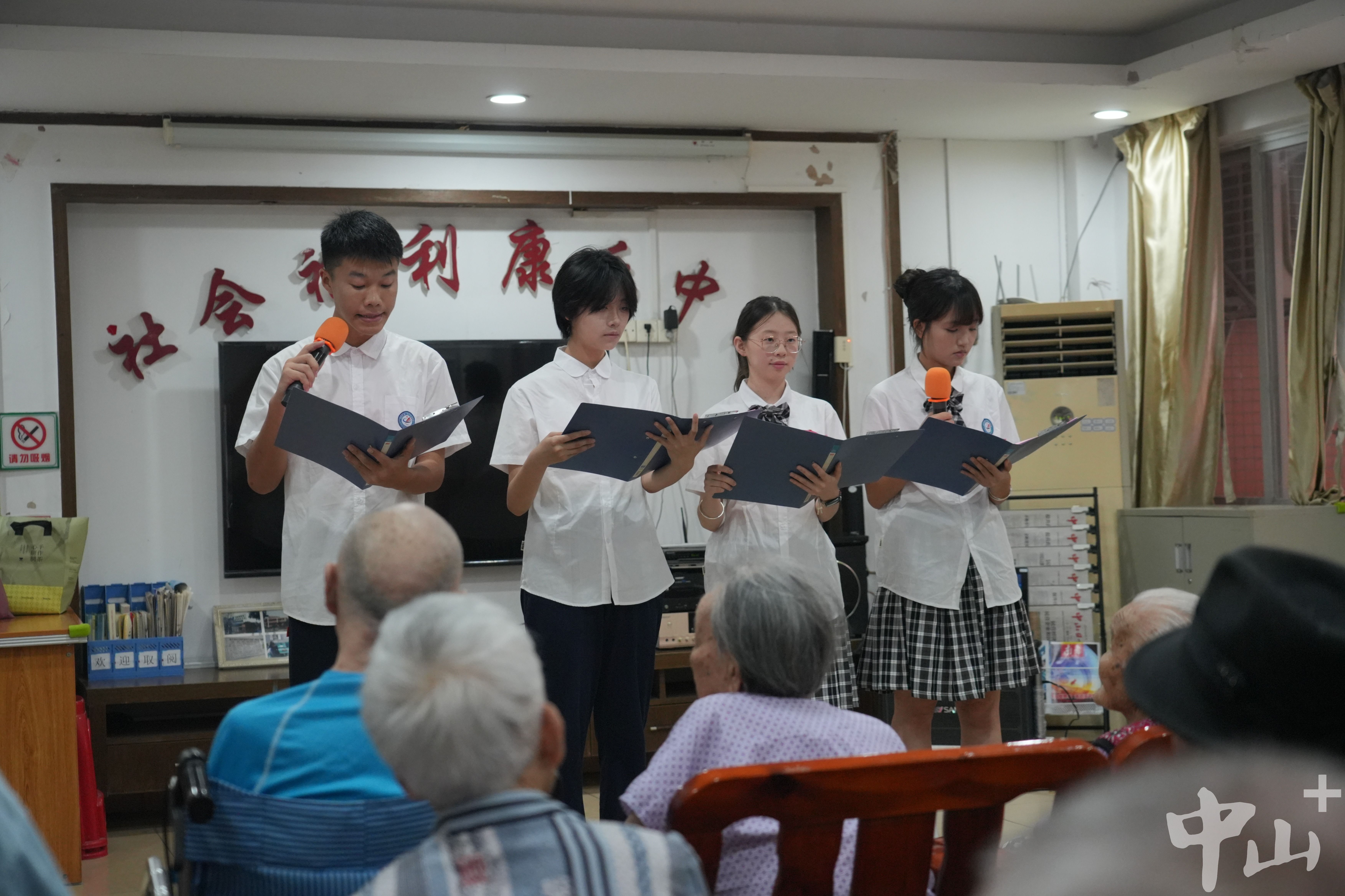 精彩的舞狮表演中,两头舞狮灵动跳跃,配合着鼓乐的节奏,将非遗文化的魅力展现得淋漓尽致,赢得现场老人的阵阵喝彩。此外,学生们还通过朗诵和合唱的形式,以深情的朗诵、深厚的情感和激昂的旋律,诉说着对美好生活的向往,经典粤语曲目跨越时空与山海,传递着振奋人心的正能量,赢得长者们的阵阵掌声。