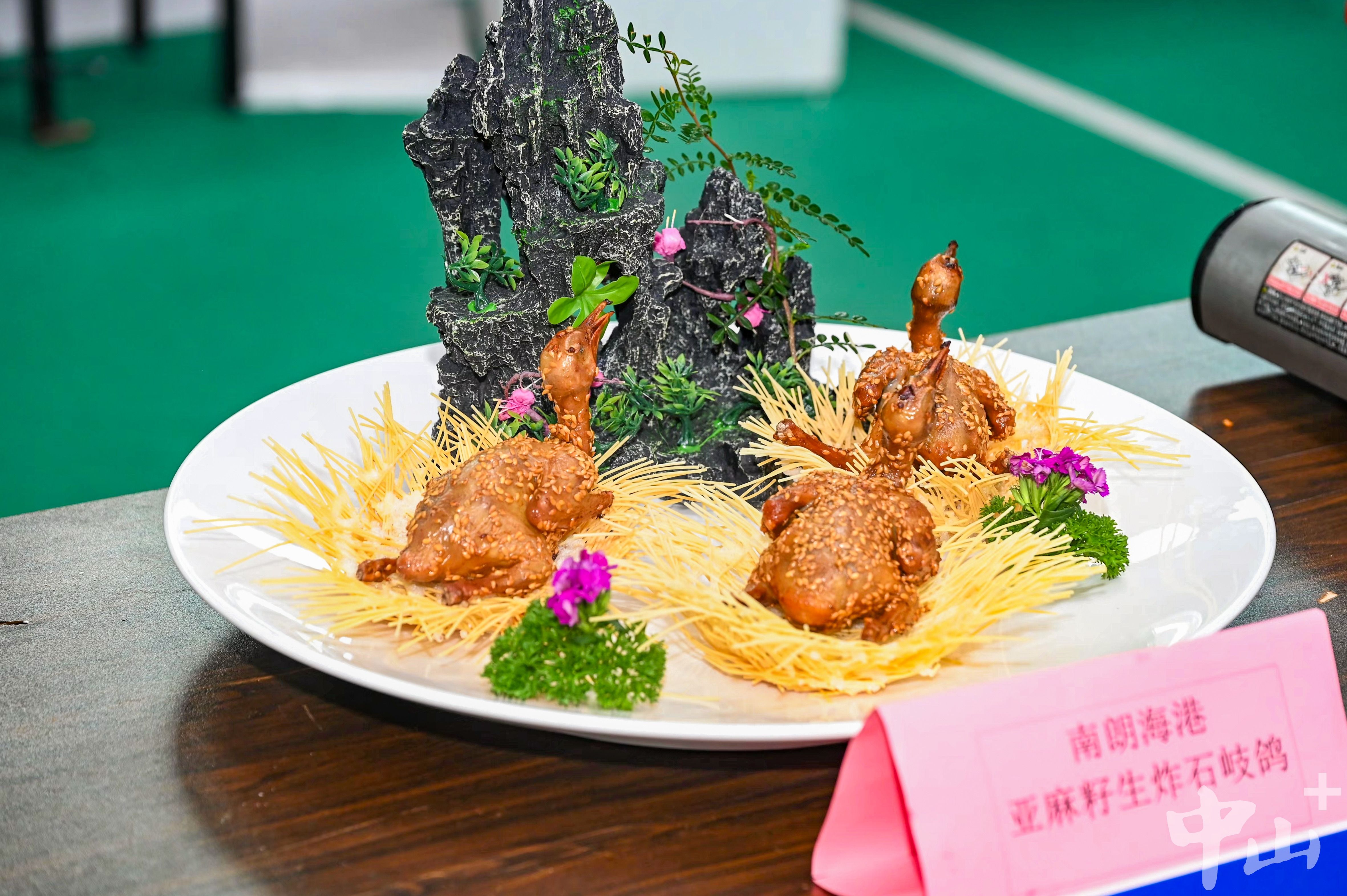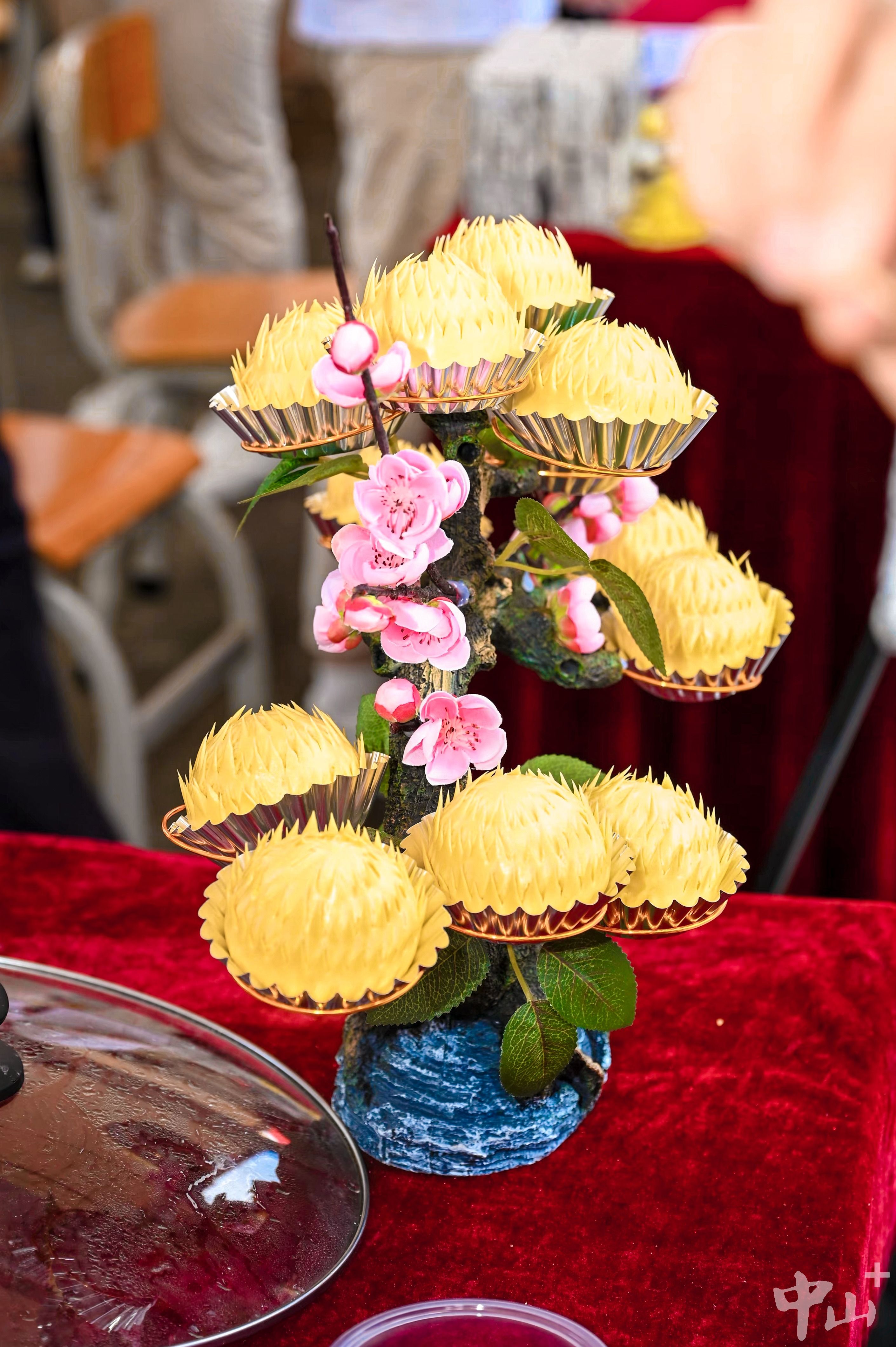 外侧广场由30多个展位组成的中山美食品鉴与烹饪技艺体验,吸引全市十多家知名餐饮企业的代表团队和千余市民共同参与,现场人声鼎沸,热闹非凡。在“三乡茶果传统饮食习俗展示区”,萝卜糕、芦兜粽的清香穿透蒸腾热气,勾勒出浓郁的乡土记忆。中山市现代职校烹饪专业的学生们灵巧地将糯米、咸蛋黄、五花肉包裹进青翠的粽叶中,再用草绳细细捆扎。该校旅游服务部部长陈燕平现场讲解道:“芦兜叶的香气会渗透到粽子里,这是中国传统文化的独特风味,也是中山的特色美食之一”一旁陈列的叶仔、豆捞等茶果,金黄的外皮、精巧的褶皱,宛如一件件精巧的艺术品,吸引许多市民驻足观看。