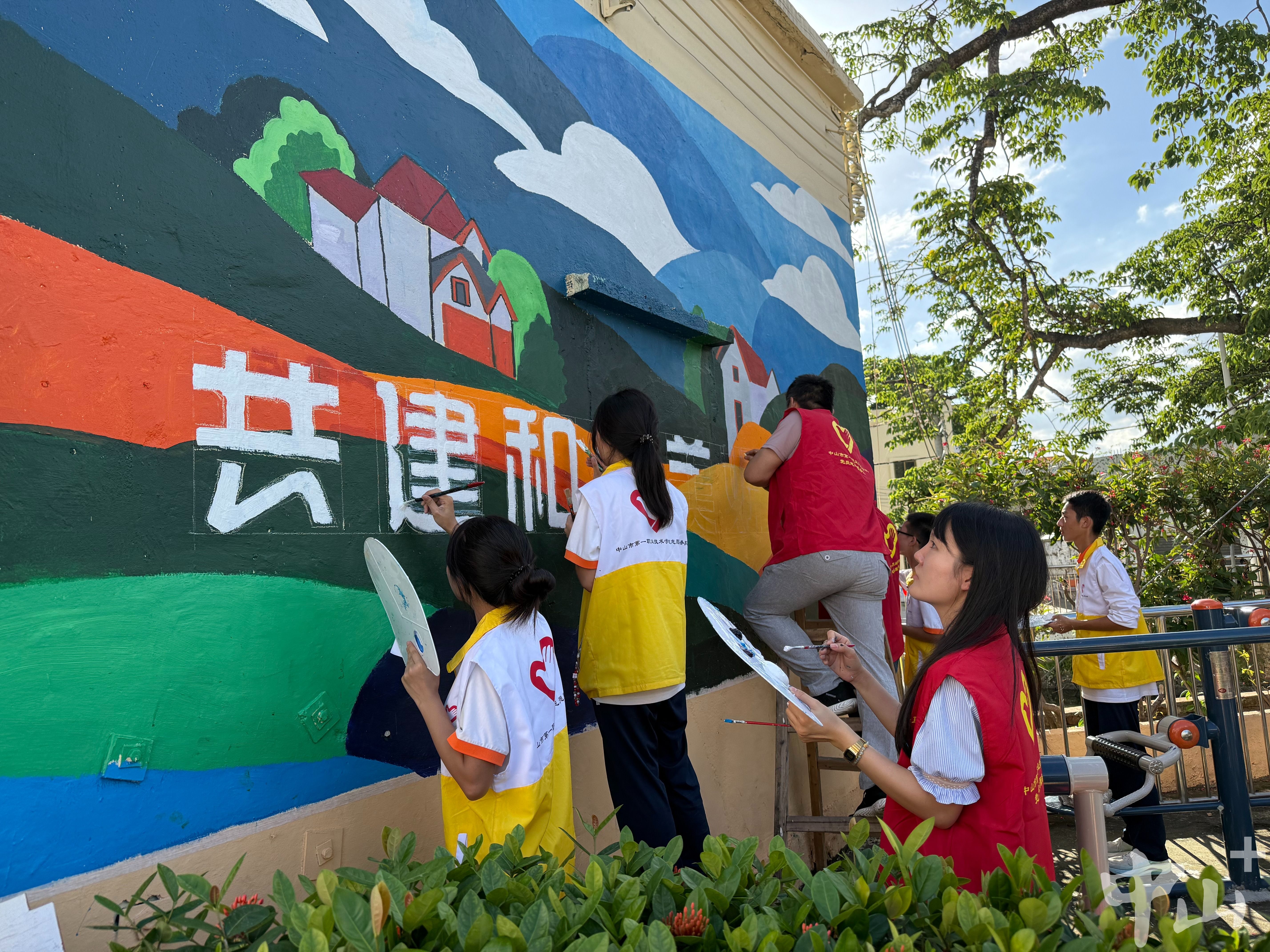 中山一职绘画、平面设计等专业的师生在横栏镇西冲社区开展墙绘工作。 学校供图