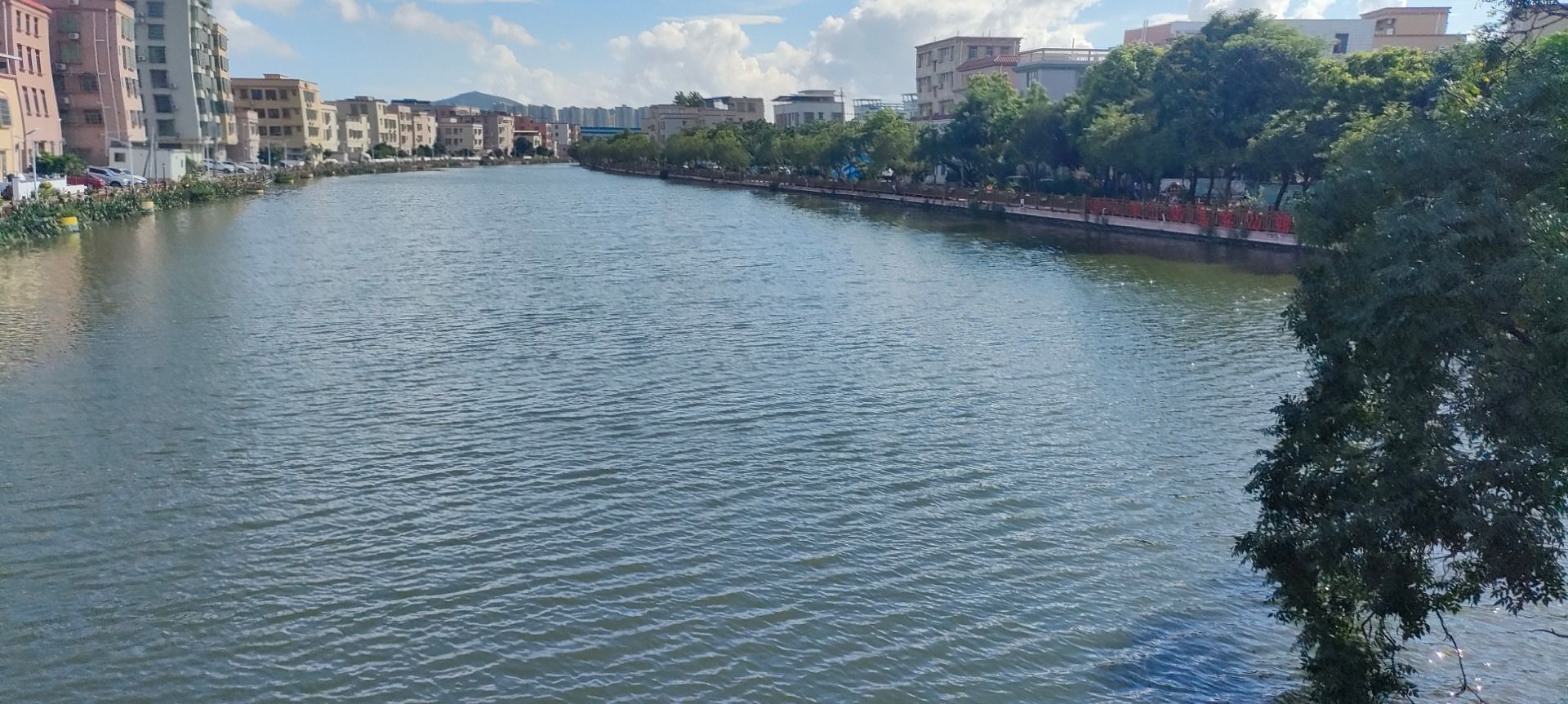周六午后,妈妈带我去安阜涌散步。站在彩虹桥上,娇艳的美人蕉摇曳起舞,放眼望去,阳光下的河面碧波荡漾,宛如一条泛着光泽的玉带。