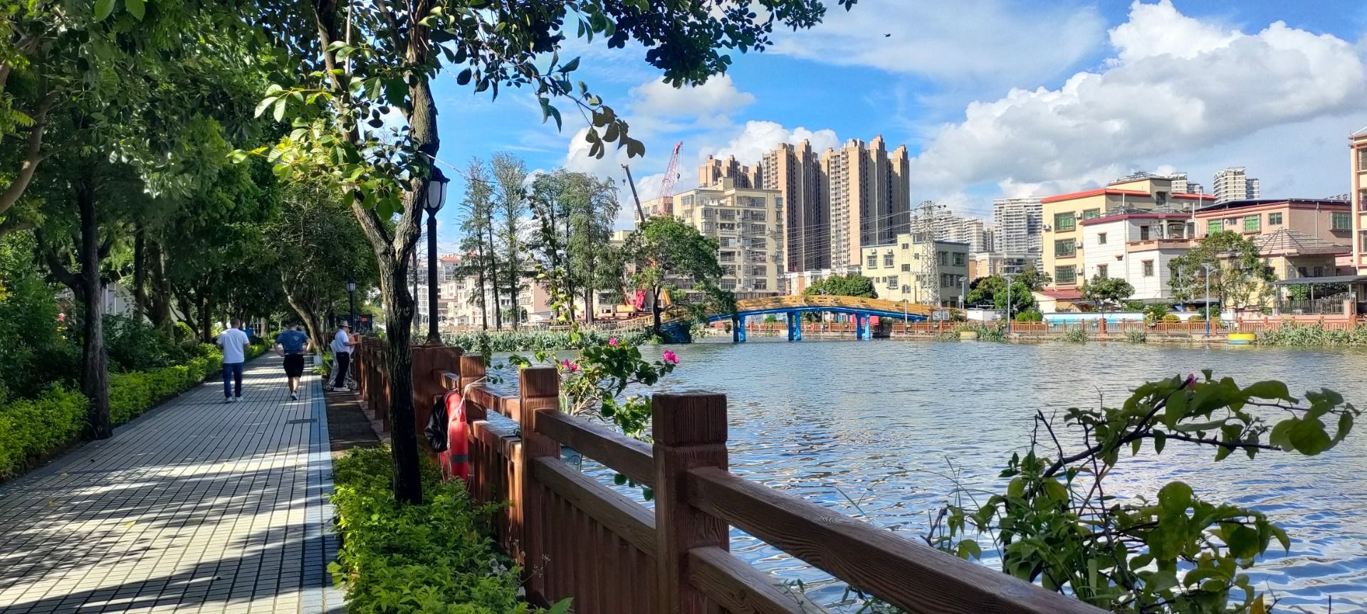 漫步河道,树木枝繁叶茂,鸟儿跳跃于枝头欢唱。栏杆上的三角梅开得红艳,微风拂来,三角梅左摇右晃,像极了大唐不夜城里那个不倒翁小姐姐,煞是可爱。