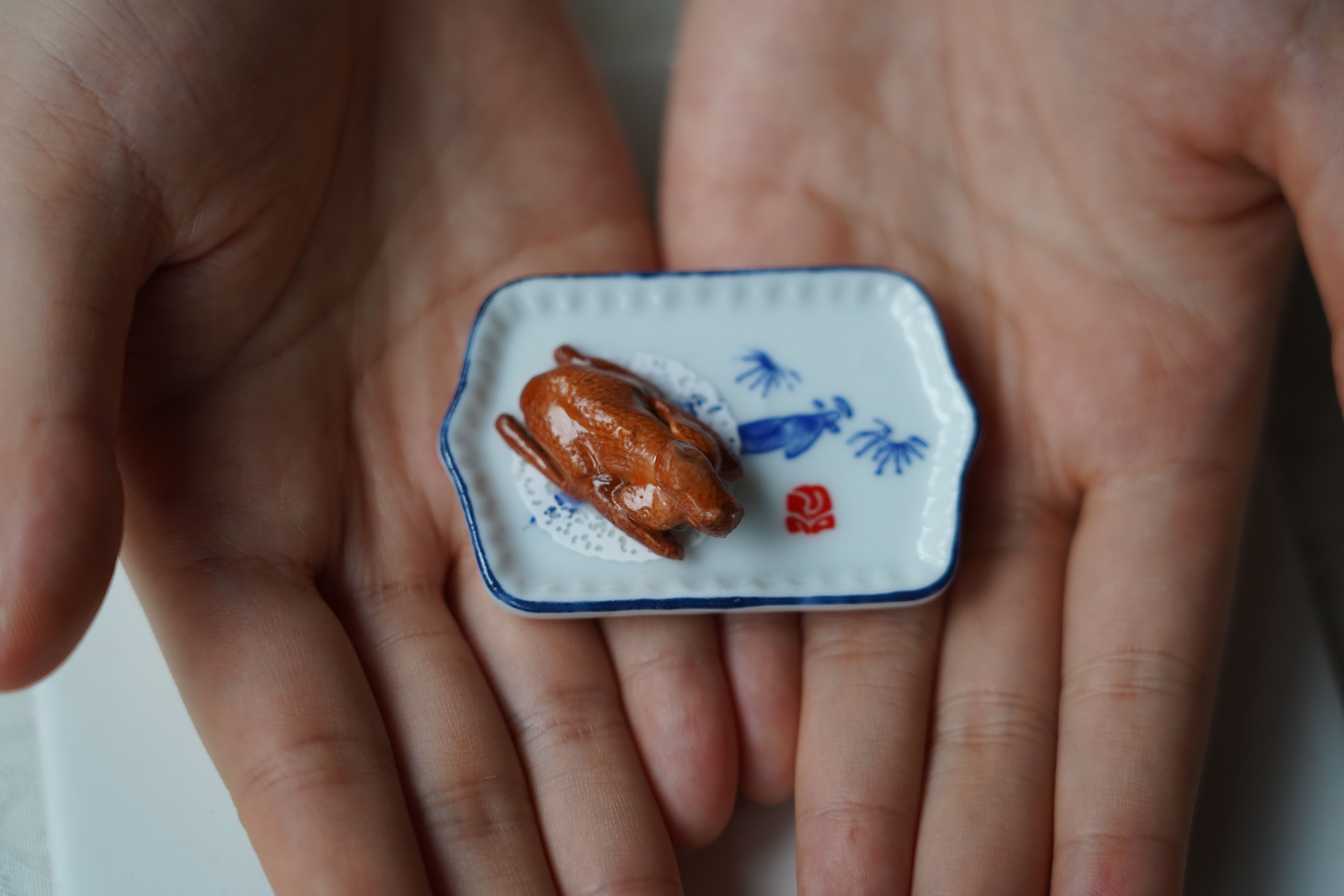 走进秦诺的工作室,那只“躺”在特制小盘子里的迷你乳鸽瞬间吸引了目光。凑近细看,油亮的“外皮”仿佛还带着刚出炉的热气,纹理清晰的“表皮”上,似乎能嗅到烤制时的焦香。轻轻拿起,手感温润,全然没有真乳鸽的滚烫,却将脆皮乳鸽最诱人的瞬间定格。即便明知它不能吃,却仍让人忍不住心生垂涎,仿佛能透过这小小的软陶,品尝到那熟悉的美味。