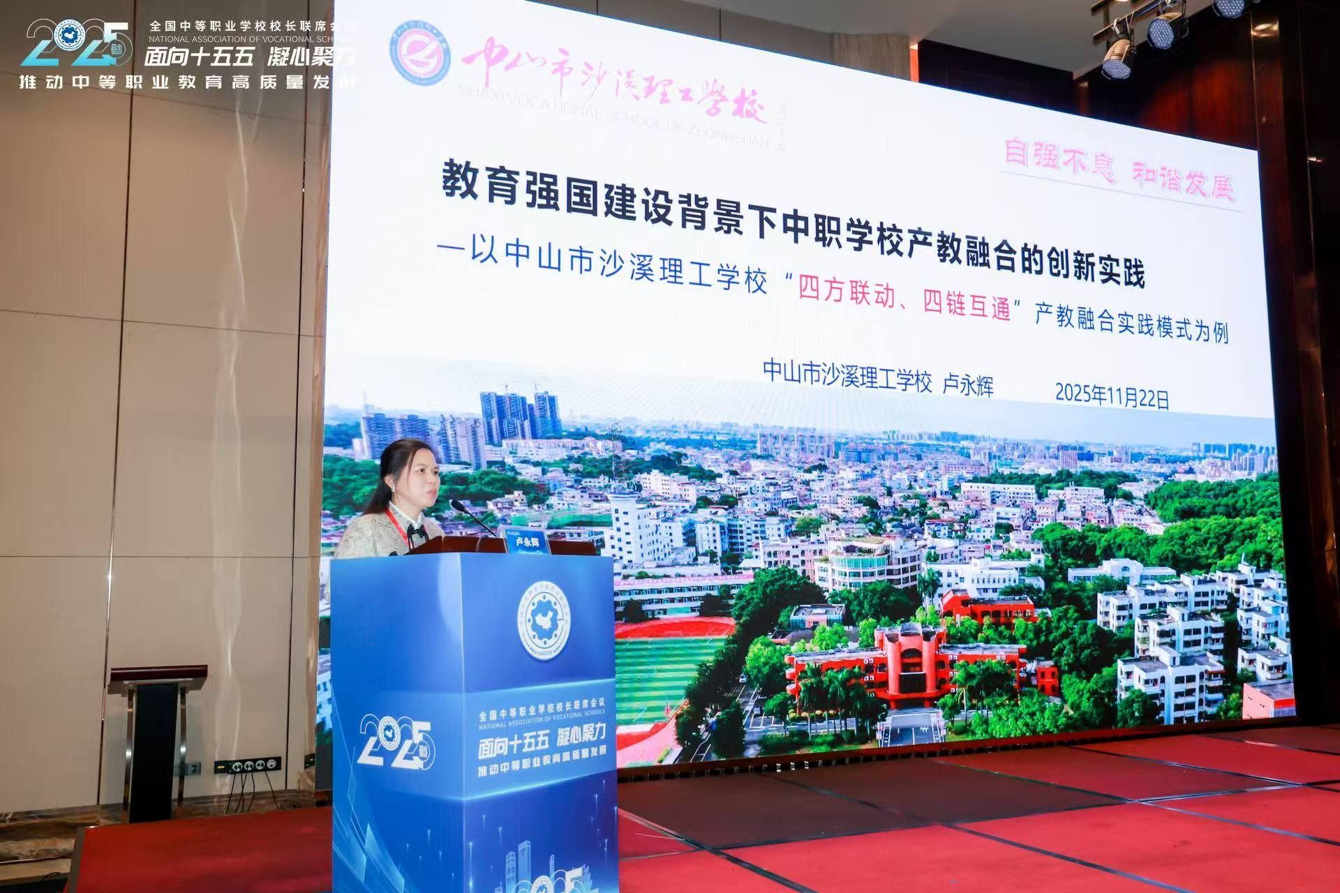 11月22日至23日,全国中等职业学校校长联席会议换届大会暨校长论坛在湖南长沙召开,来自全国31个省(区、市)的400余名校长参会。会上,中山市沙溪理工学校党委书记卢永辉受邀在第一分论坛作《教育强国建设背景下中职学校产教融合的创新实践》主题分享,系统阐述学校“四方联动、四链互通”产教融合模式,该模式已入选教育部2024年产教融合典型案例,引发广泛关注。