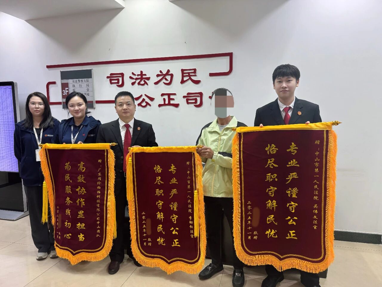“感谢法官为我们解决了多年来的烦心事!”近日,在中山市第一人民法院执行局内,当事人宋先生满怀感激地将三面锦旗分别送到执行法官吴伟文、李劲松及同伦拍卖辅助团队手中。这一动人场景,为一起持续多年的兄弟房产纠纷画上了圆满句号。