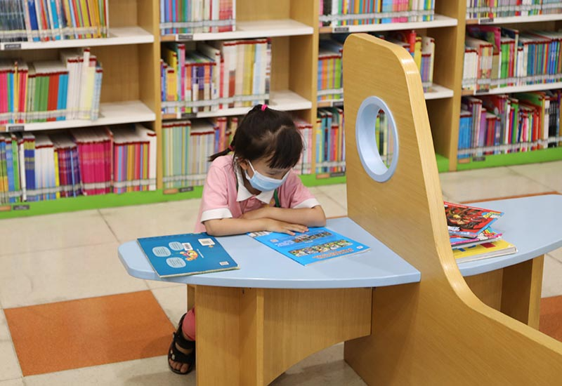一名小朋友在阅读区里专心致志地阅读书籍。(摄影:王云)