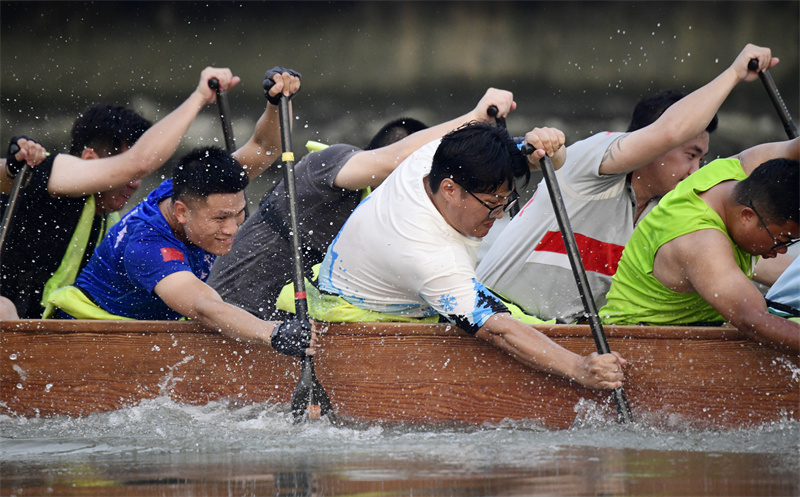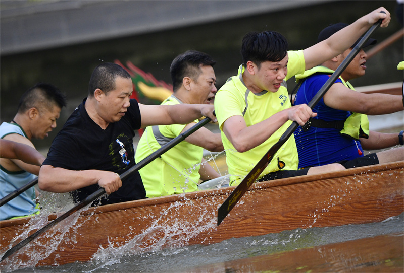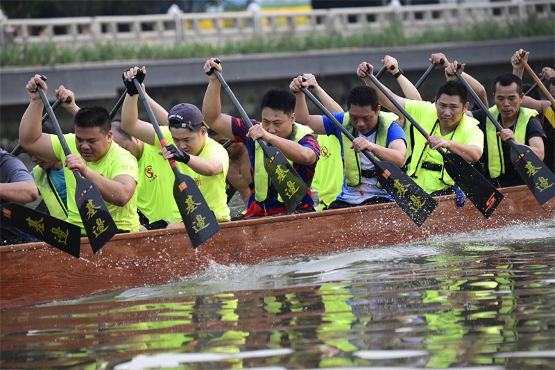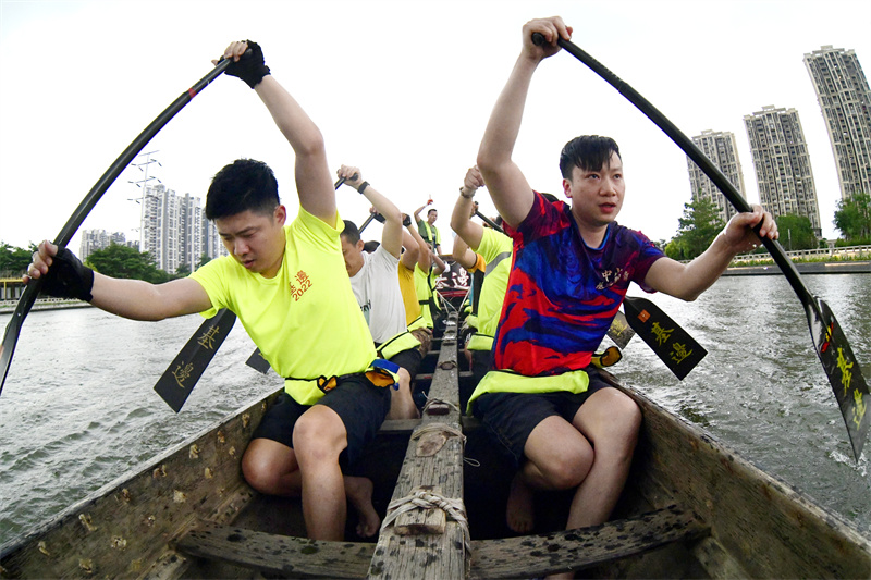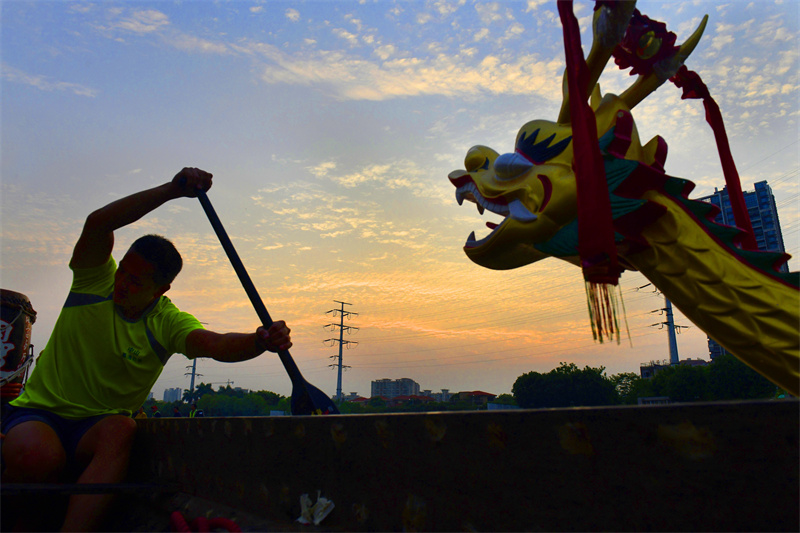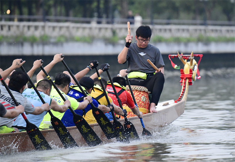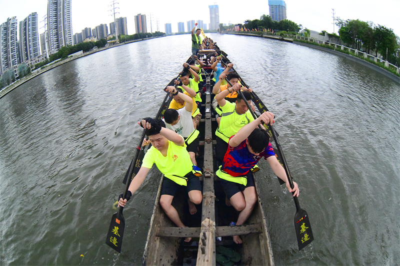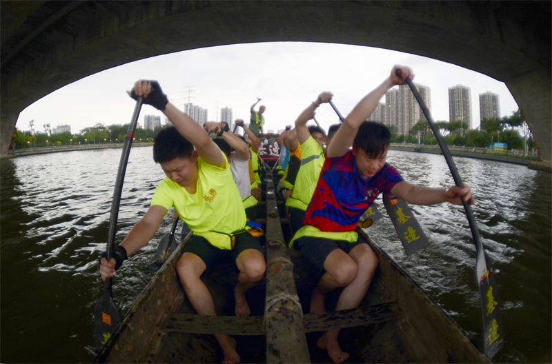 6月13日傍晚,岐江边锣鼓喧天,随着一阵鞭炮声响,一条长龙飞驰而出,石岐基边联青龙舟队的队员们坐在龙舟上开始了划桨训练。