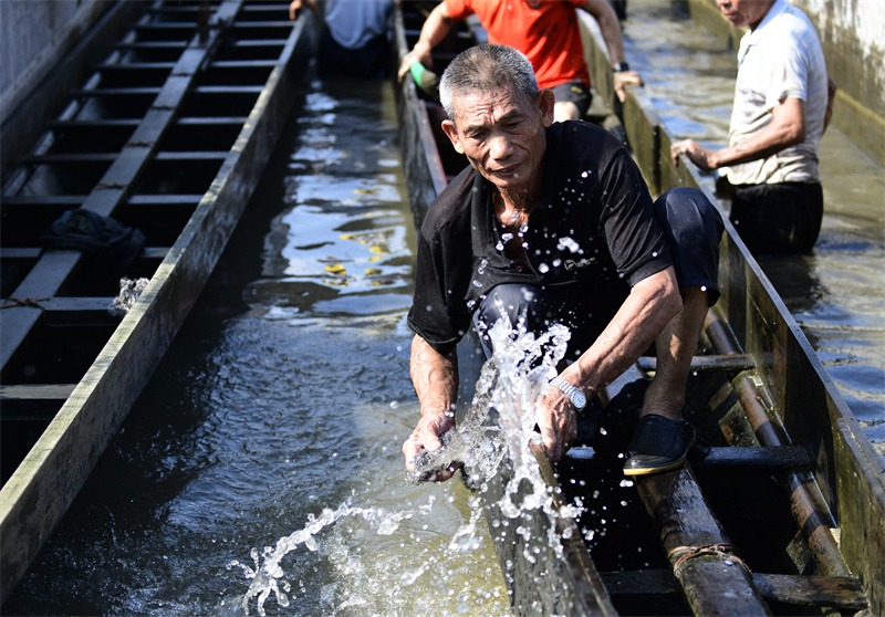 合力抬龙舟,一起舀水,共同洗刷船身,推动“猛龙出海”……参加“起龙”的大多是鳌山村老一辈的村民,他们对龙舟文化有着深厚的情感。除了热心“起龙”的老前辈,一些年轻人也有着参与龙舟活动的热情,龙舟文化在热闹氛围中传承。