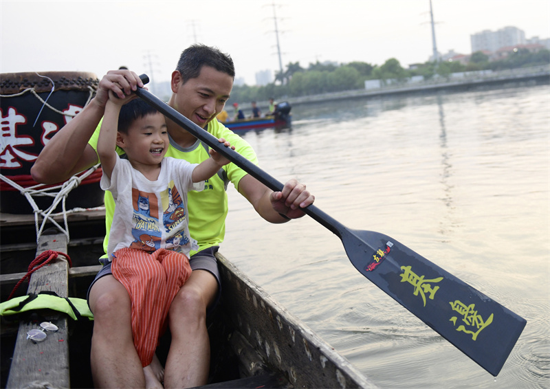 ▲队员手把手教自己儿子划桨,传承龙舟文化。