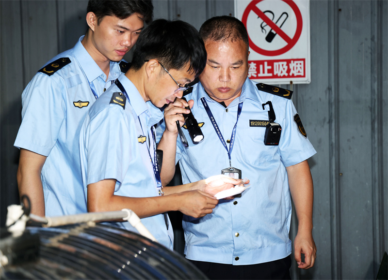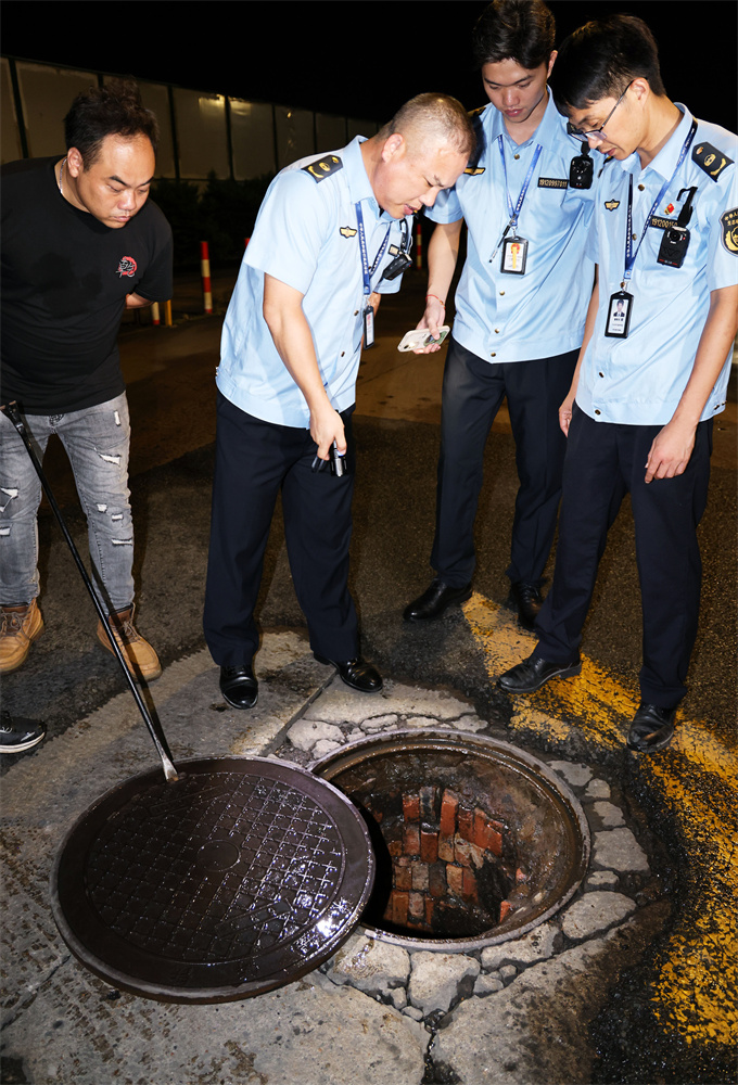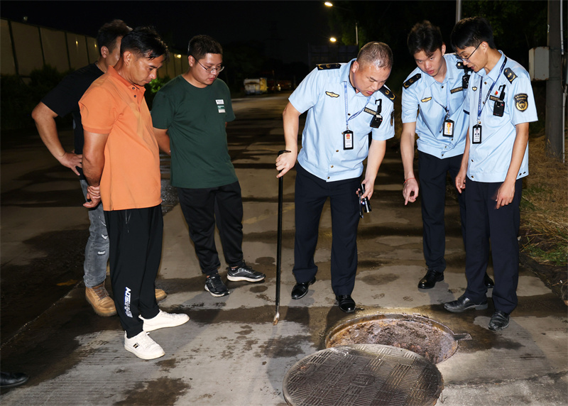 ▲执法人员对排水管道进行掀盖检查。