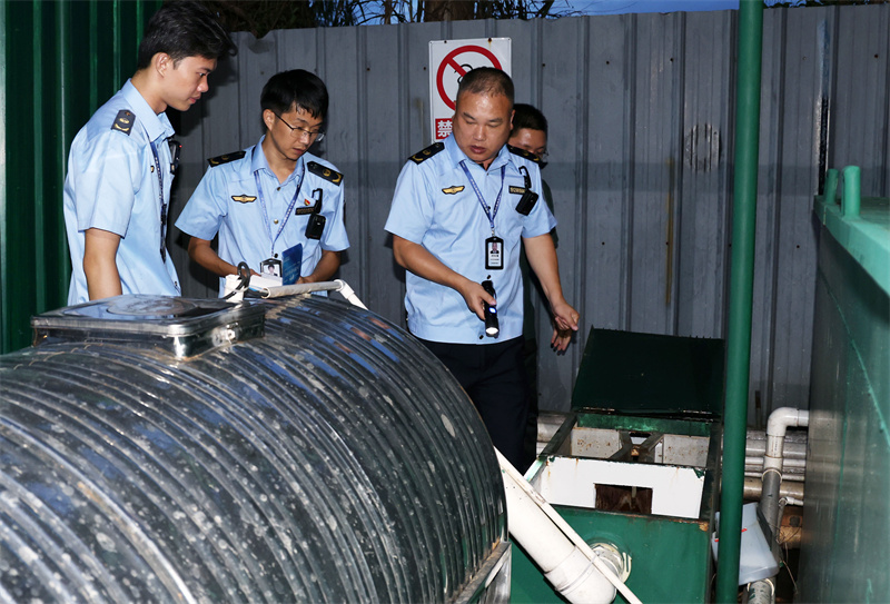 ▲执法人员检查垃圾场内的污水处理池。