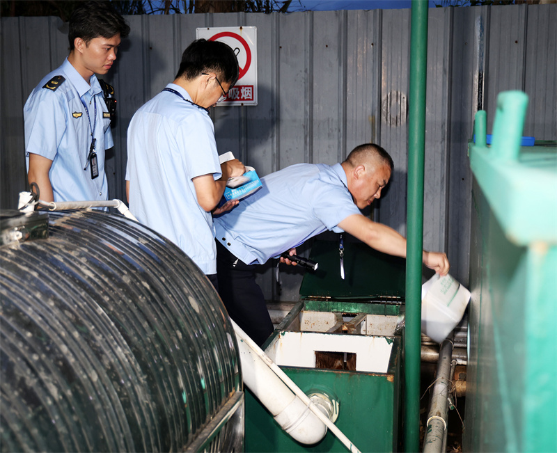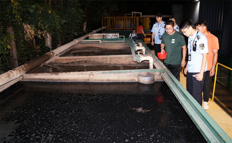 当晚,市生态环境局执法部门工作人员现场复核该垃圾场内配套的垃圾渗滤液处理设施,对外排废水进行化学需氧量及电导率的快速检测,“正常情况下,污水收集池内污水应通过后续处理设施处理后,再经规范化排放口排放。”现场,垃圾处理场的污水处理池内正进行着生化处理。工作人员进行采样,化学需氧量指标在允许排放标准内。工作人员还对几处排水管道进行了掀盖检查,进一步了解污水排出情况。