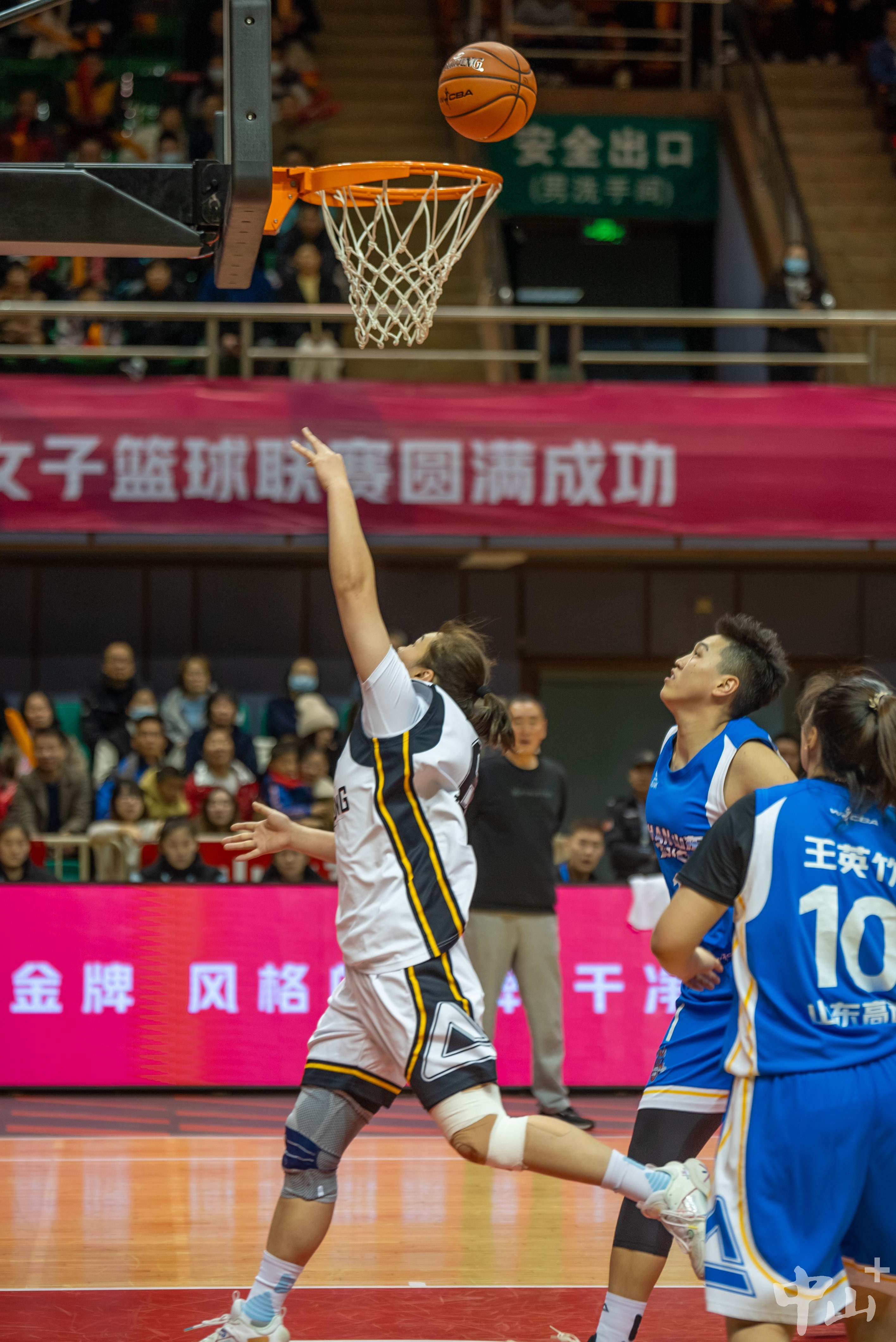 ▲12月19日晚,广东东莞新彤盛女篮(白衣)以87∶67战胜山东高速女篮(蓝衣)。记者 黄艺杰 摄