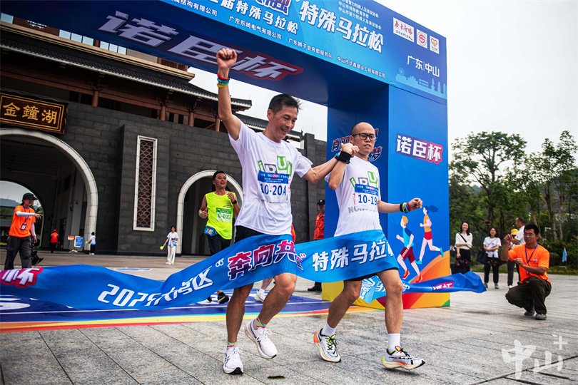 ▲两名10公里跑者手挽手冲线,笑声与汗水交织成难忘瞬间。张景天 摄