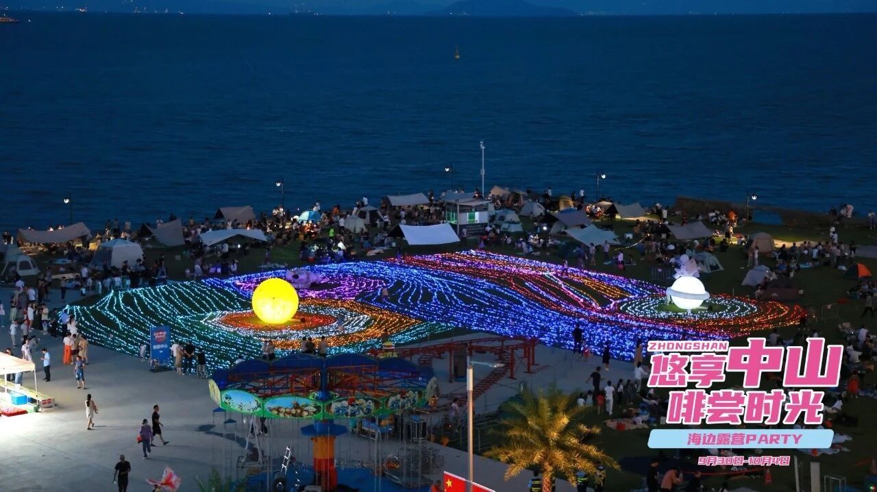 由广东中山文旅集团有限公司主办并特别推出的飞阅“百千万”主题无人机光影表演,以“免费开放”的户外形式,为市民游客献上中山专属“文旅福利”。2000架无人机同步升空,呈现孙中山故居纪念馆、深中通道、桂山岐水自然风光、中山地道美食等系列中山标志性元素。本次海边露营Party活动场地成为观看无人机演出的绝佳观赏点之一。
